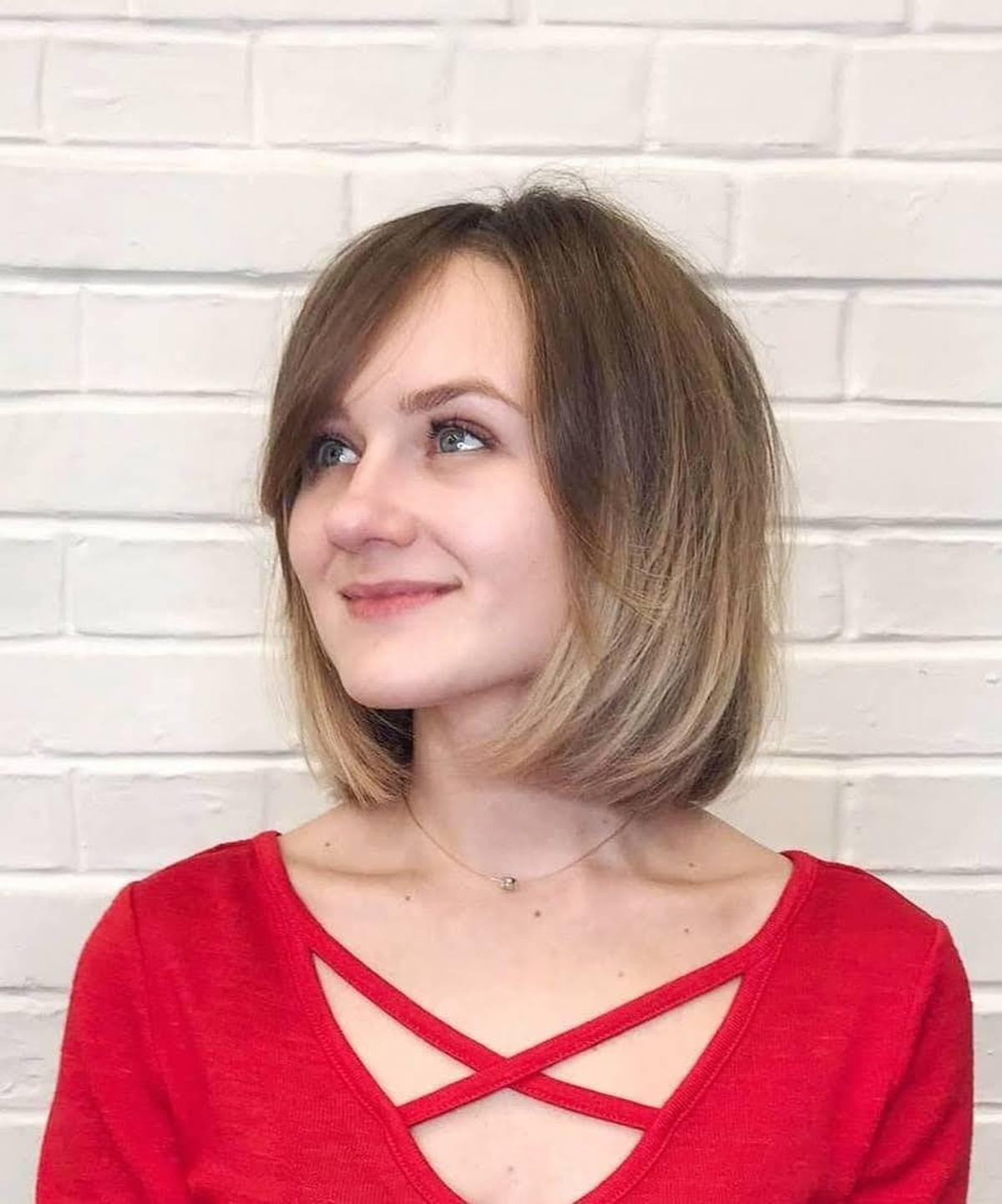 With side bangs, a neck-length blunt bob appears elegant for square-faced women. It’s the hairstyle that softens a defined jawline. For a more refined blunt cut with side bangs, it’s ideal to use a curling iron on the ends curling inwards. Adding an ombre hair color to your short hair can enhance the overall look as well.