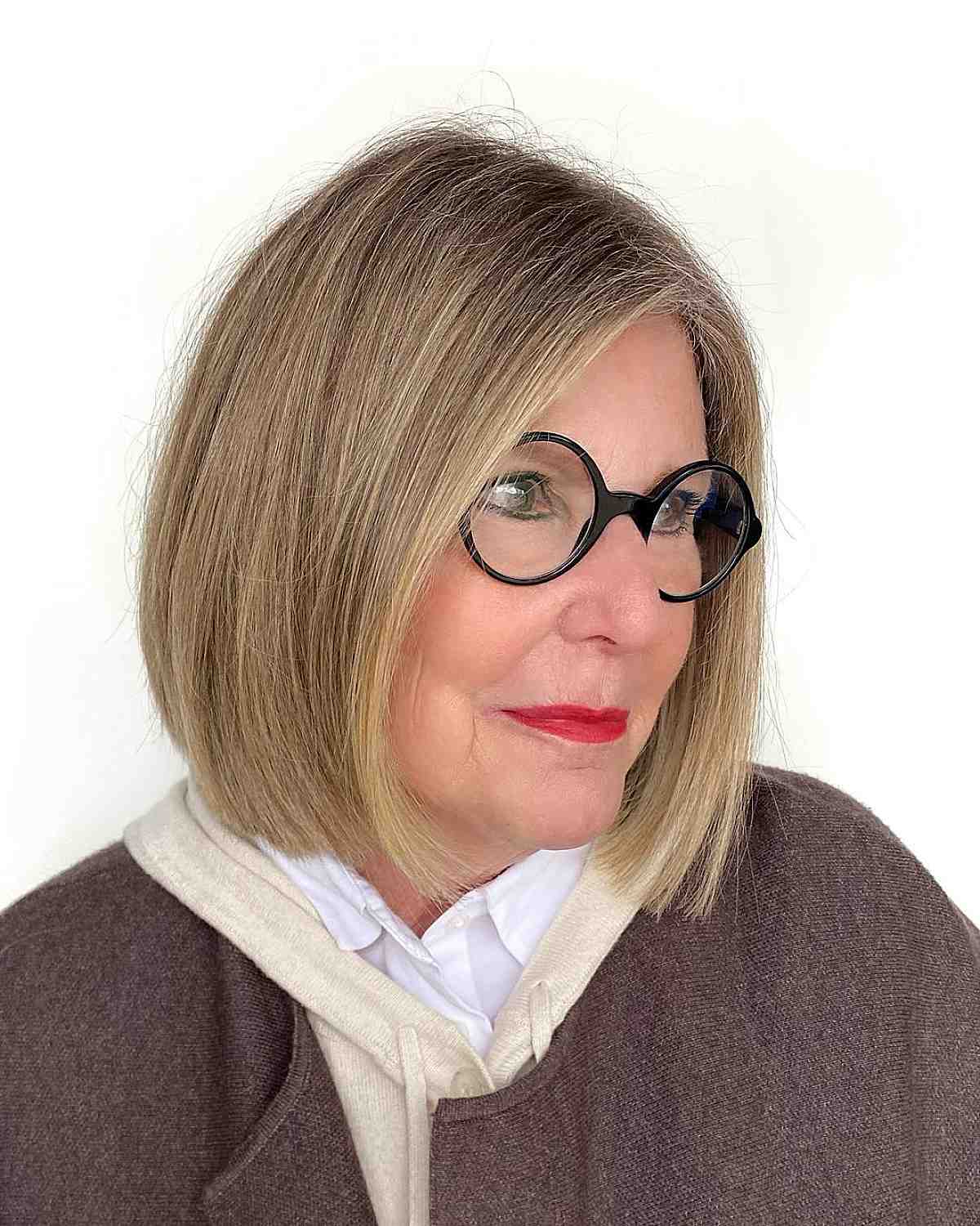Often referred to as “the Diane Keaton,” a chic blunt cut is an excellent option for senior women with glasses. This hairstyle is popular among bespectacled ladies—the long lengths around the face conceal any potential kinks caused by eyeglasses around the ears.