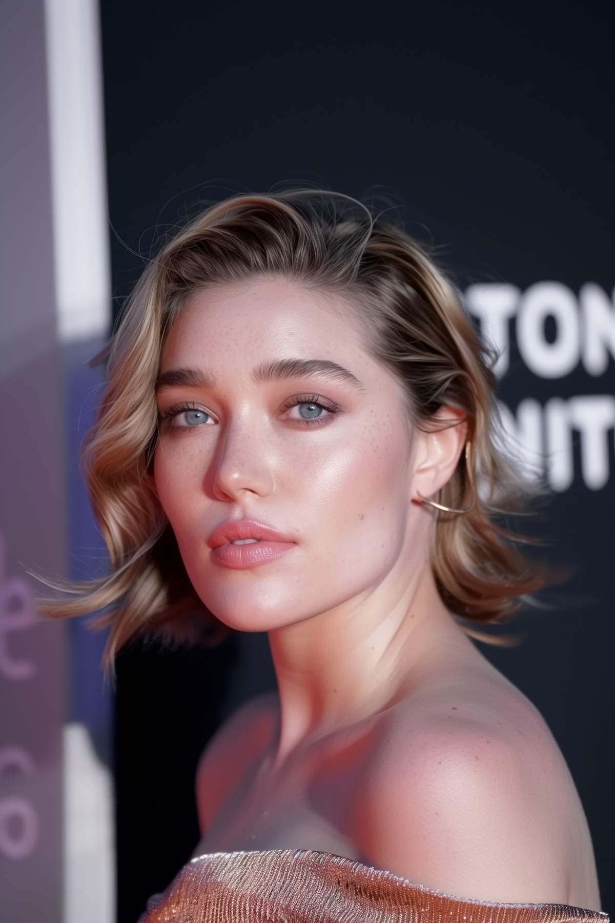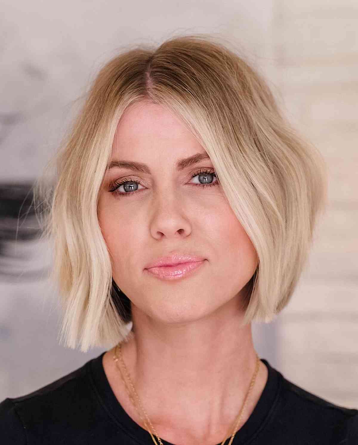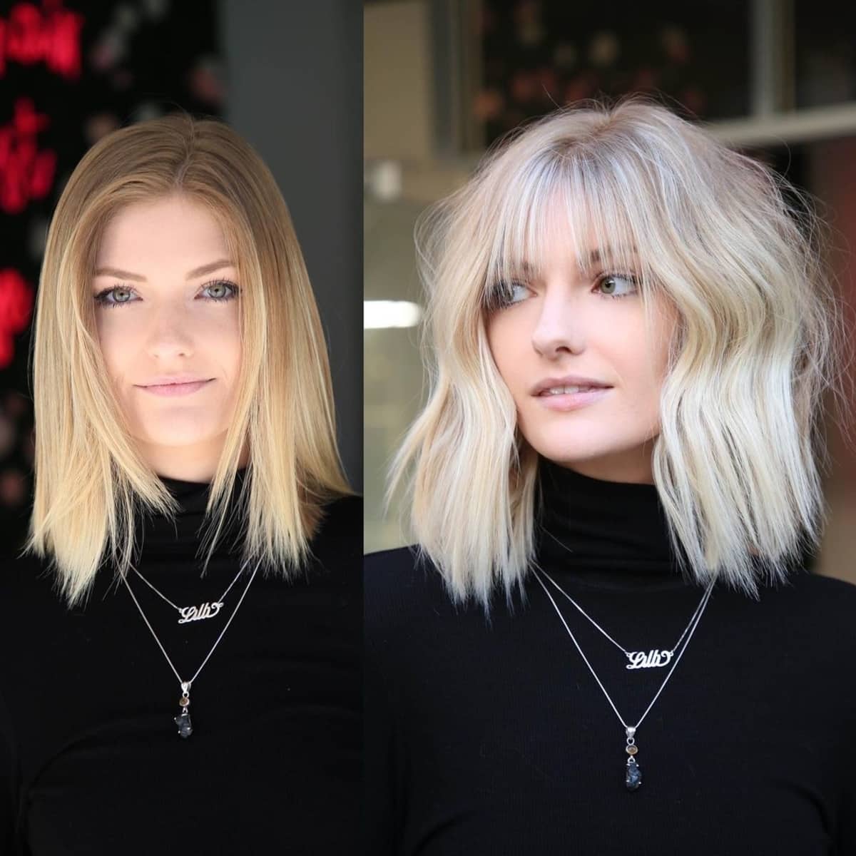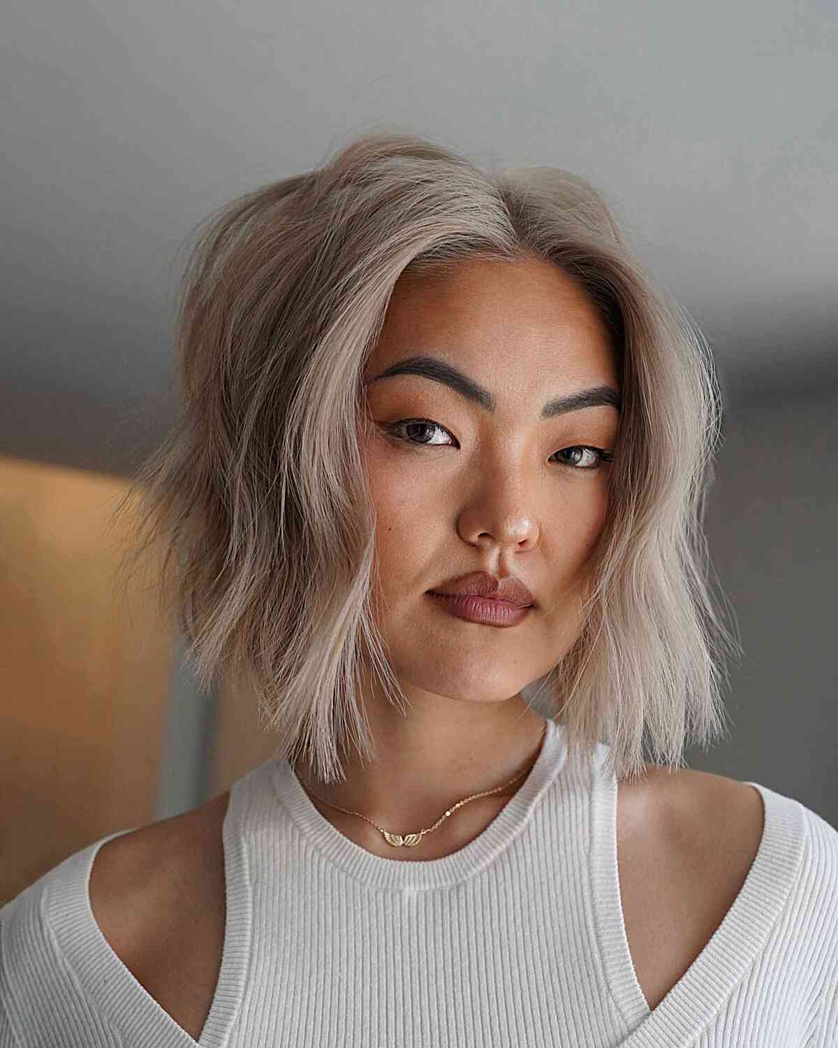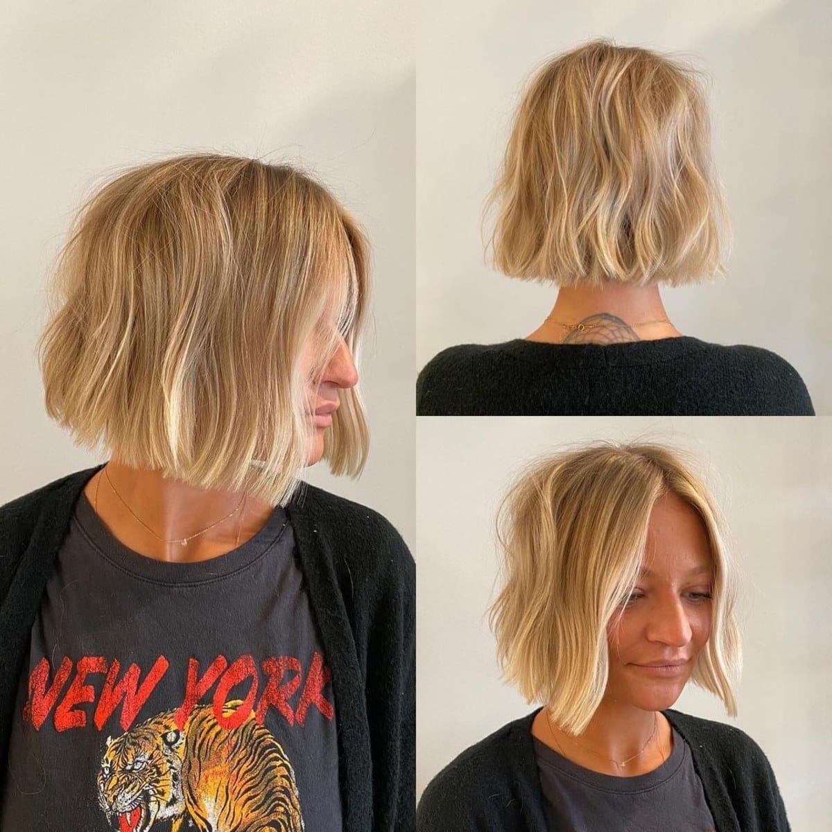 Think about a blonde bob and consider creating a warm tone in your hair. Reflect on which styles you prefer or dislike. Your stylist will guide you on how to style your blunt short bob. Tousled waves add dynamics to your color and shape for your overall look.