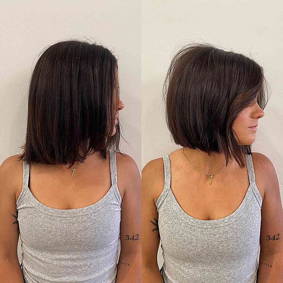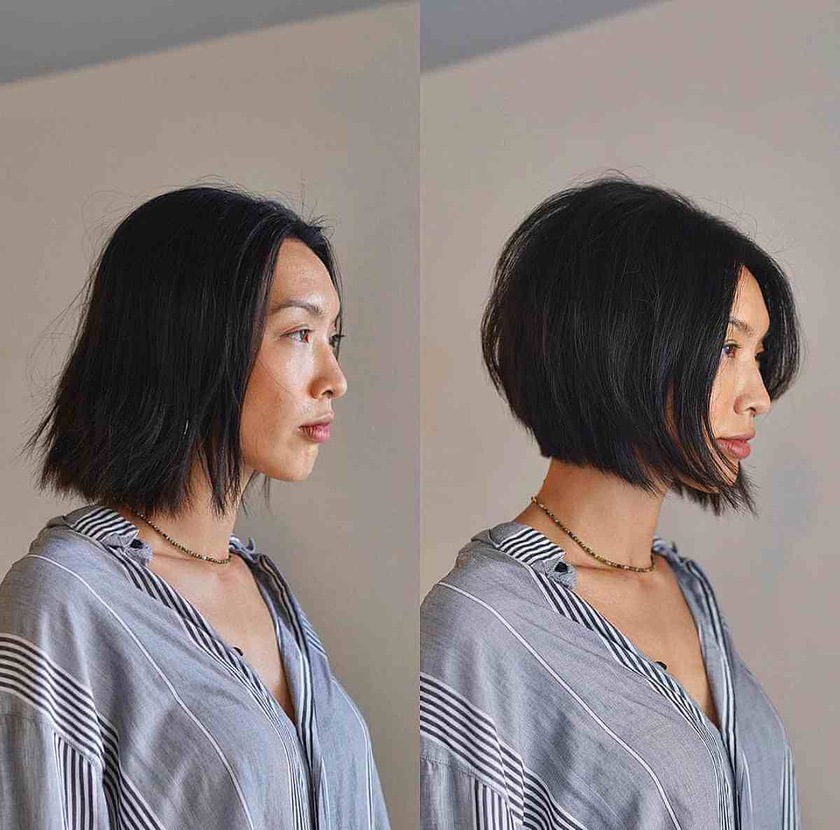 This classic one-length blunt haircut creates a perimeter that enhances hair’s health and vibrancy. Women with any hair density can easily embrace this style. Do you have fine, medium, or thick locks? This haircut is guaranteed to look stunning! One-length blunt cut bobs will require routine trims to maintain a polished look and prevent split ends.