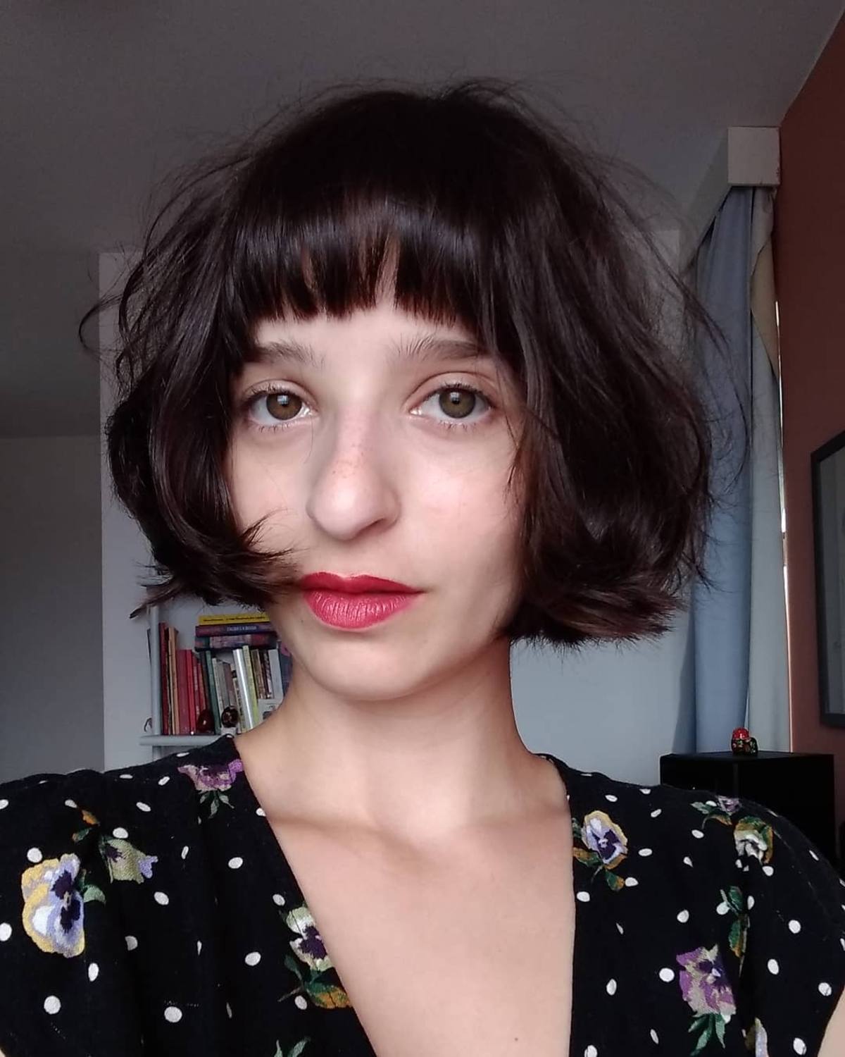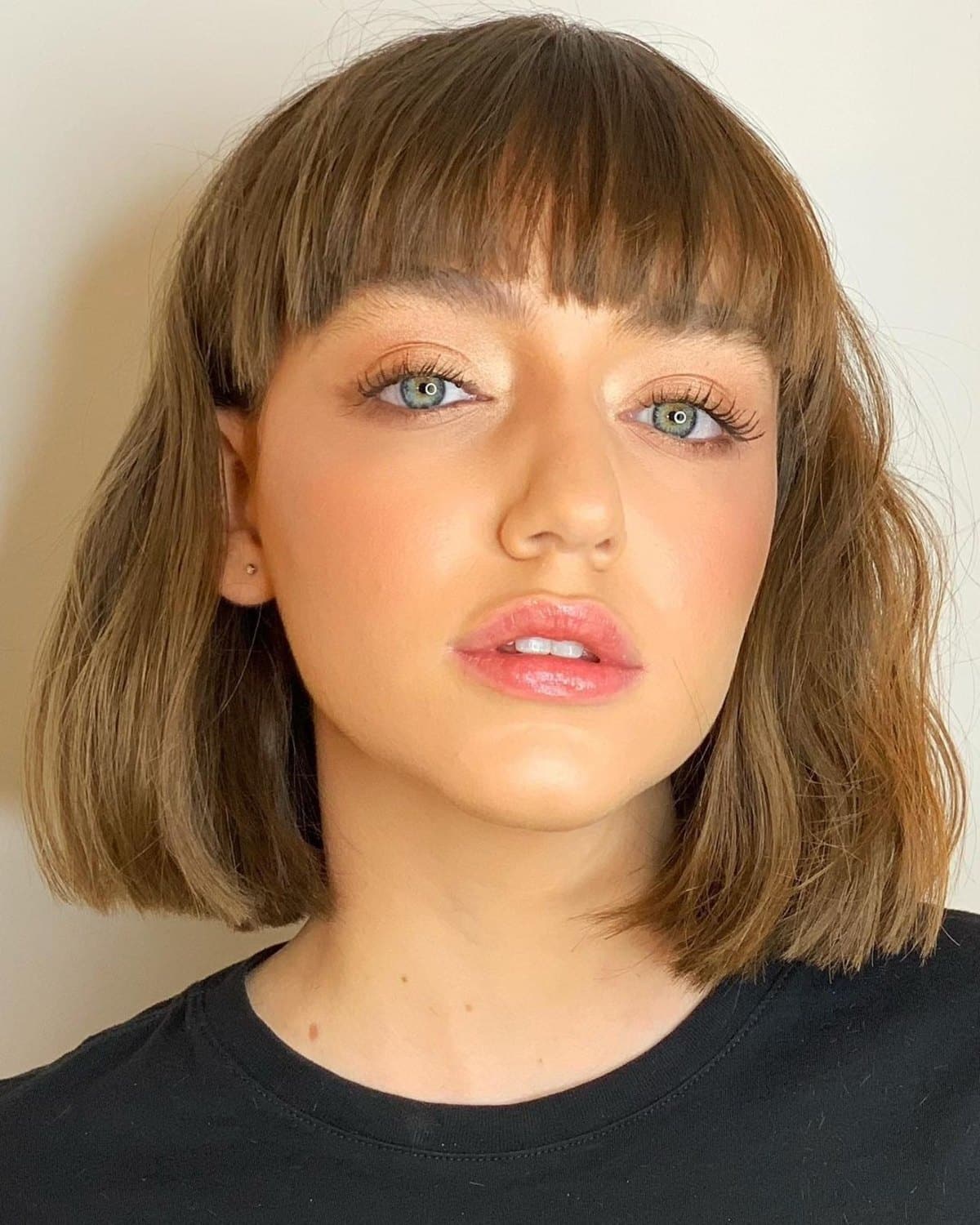 When the chic blunt bob grows out evenly, it looks fantastic on a longer length. This chop doesn’t have any heavy layering. With a wavy hair texture, it appears natural and effortless. What makes this blunt French bob haircut even more flattering is the fringe. The bangs add extra texture and movement to it.