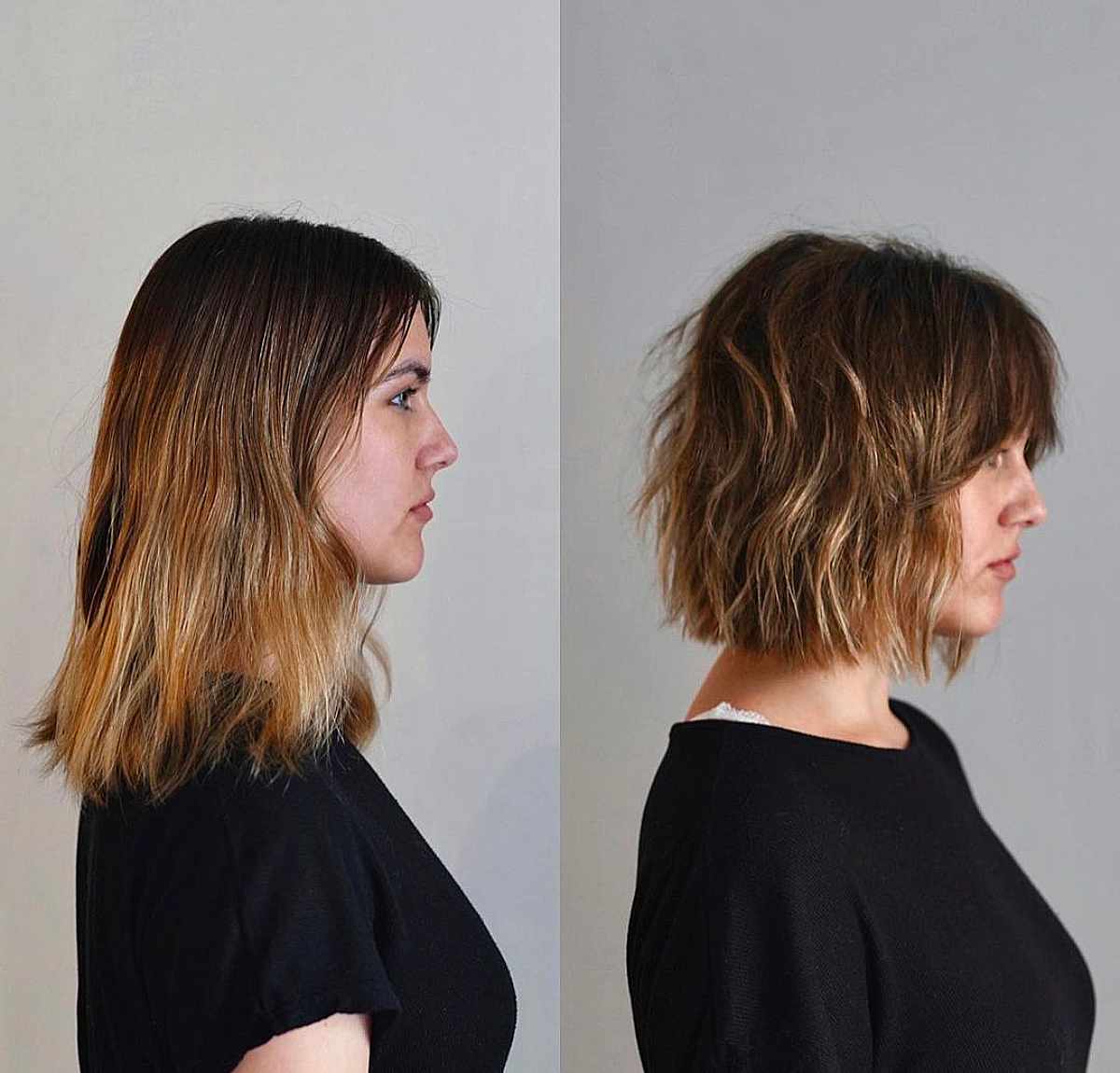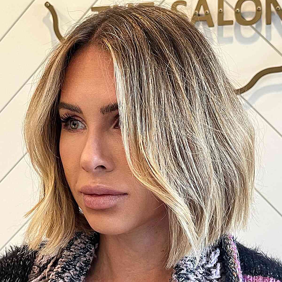 What’s appealing about a stylish short blunted bob with balayage is it suits both sleek and tousled textured hair. I typically use invisible and internal or deep layers to create this cut. For styling, a quality texturizer spray is advised to keep it looking fresh at home. Allow it to grow for a few weeks to achieve a medium blunt cut if you seek more versatility.