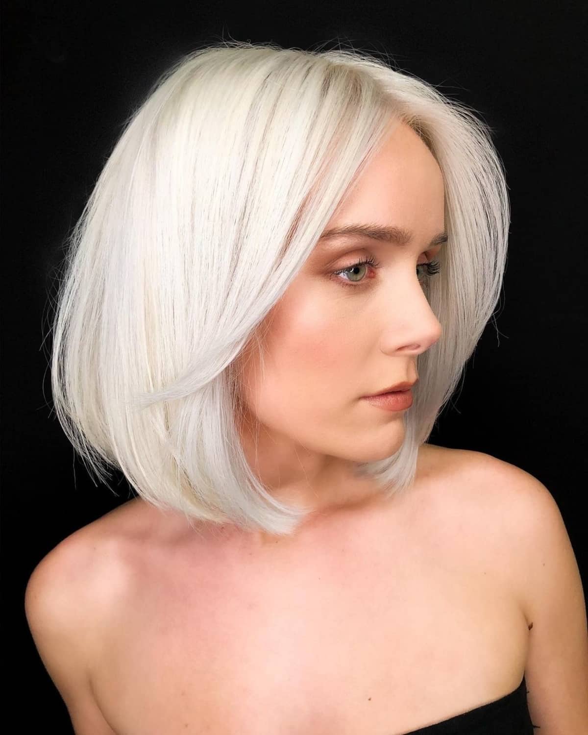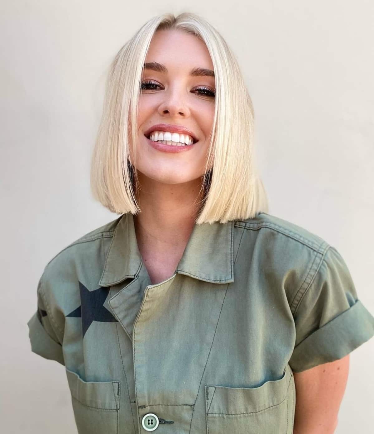 One of the most striking blunt bobs is a platinum one-length blonde bob. The beautiful white-blonde shade demands considerable time, money, and effort to achieve so that it will stand out in a crowd. If you have fine hair, the blunt perimeter line will create the illusion that your hair is thicker. Be sure to use moisturizing products with heat protection and schedule regular maintenance appointments (every 4 – 6 weeks) to keep your hair as healthy as possible.