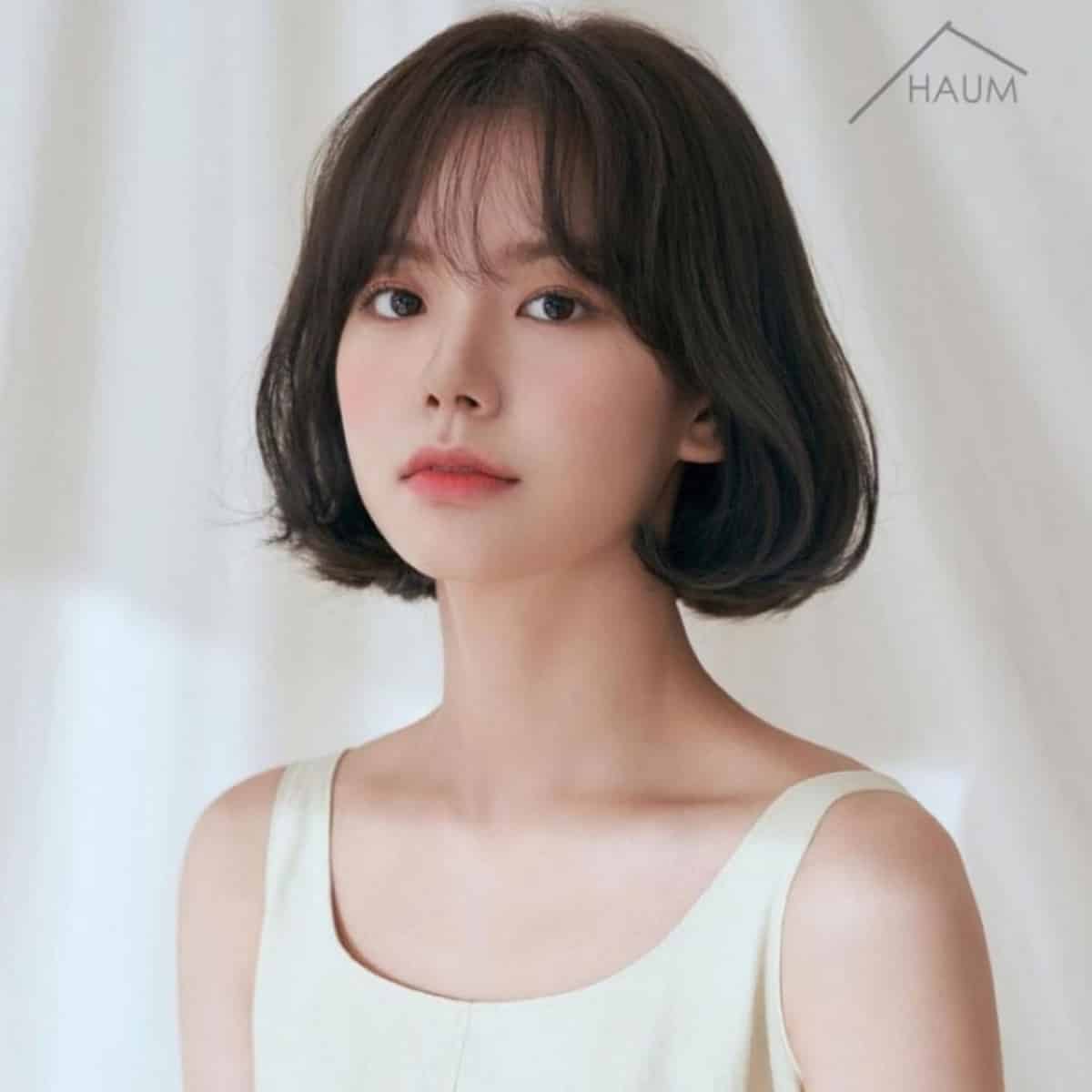A short blunt bob in Korean fashion is a sophisticated option. A charming C-under curl added to a bob will provide your hair with ample volume and body. This is ideal for medium-density hair. This style can be easily achieved with a blow-dry and curling iron. Introduce some delicate bangs to frame your face so it doesn’t feel heavy around the eyes.