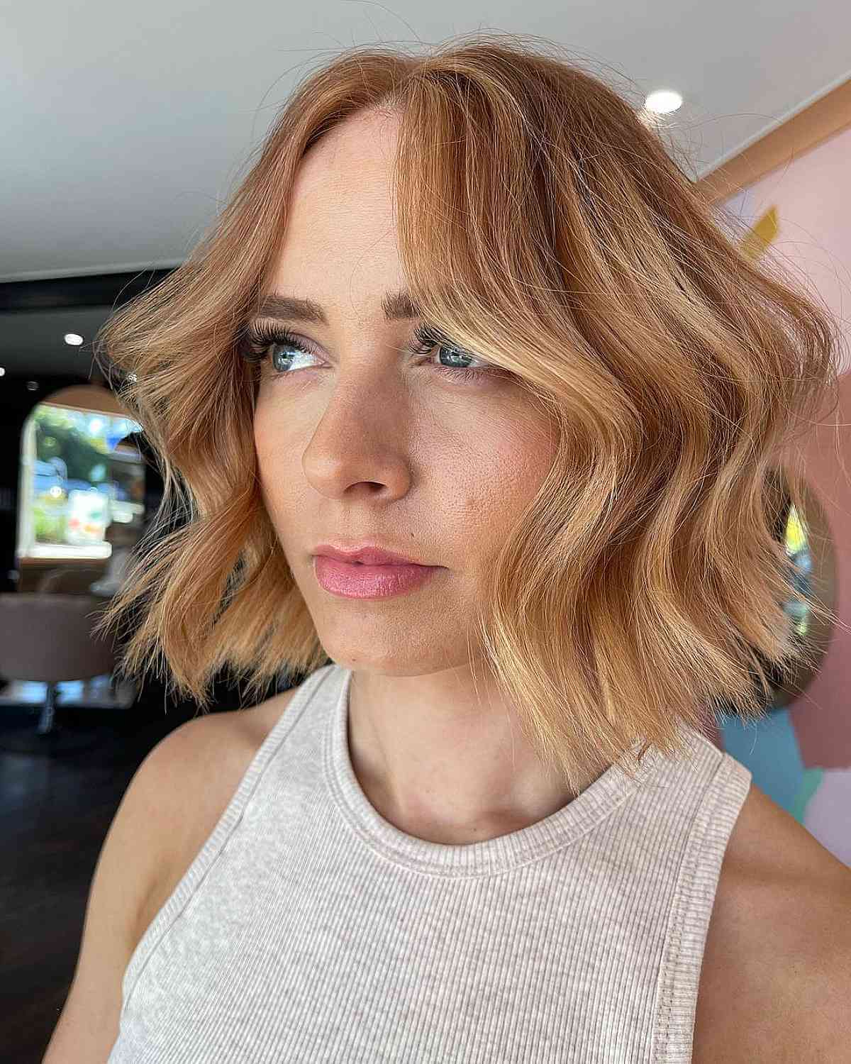 A bob hairstyle is a classic option for everyone. A square baseline paired with longer layers creates a lovely wavy silhouette. Copper shades in mid-apricot are particularly striking on those with naturally lighter locks. This color brings warmth to your skin tone, imparting a golden shimmer. It’s also an ideal choice for experimenting with copper tones without opting for a darker or redder hue. Consider how frequently you’ll need to touch up your new color, as it may require more regular maintenance than you’re accustomed to.