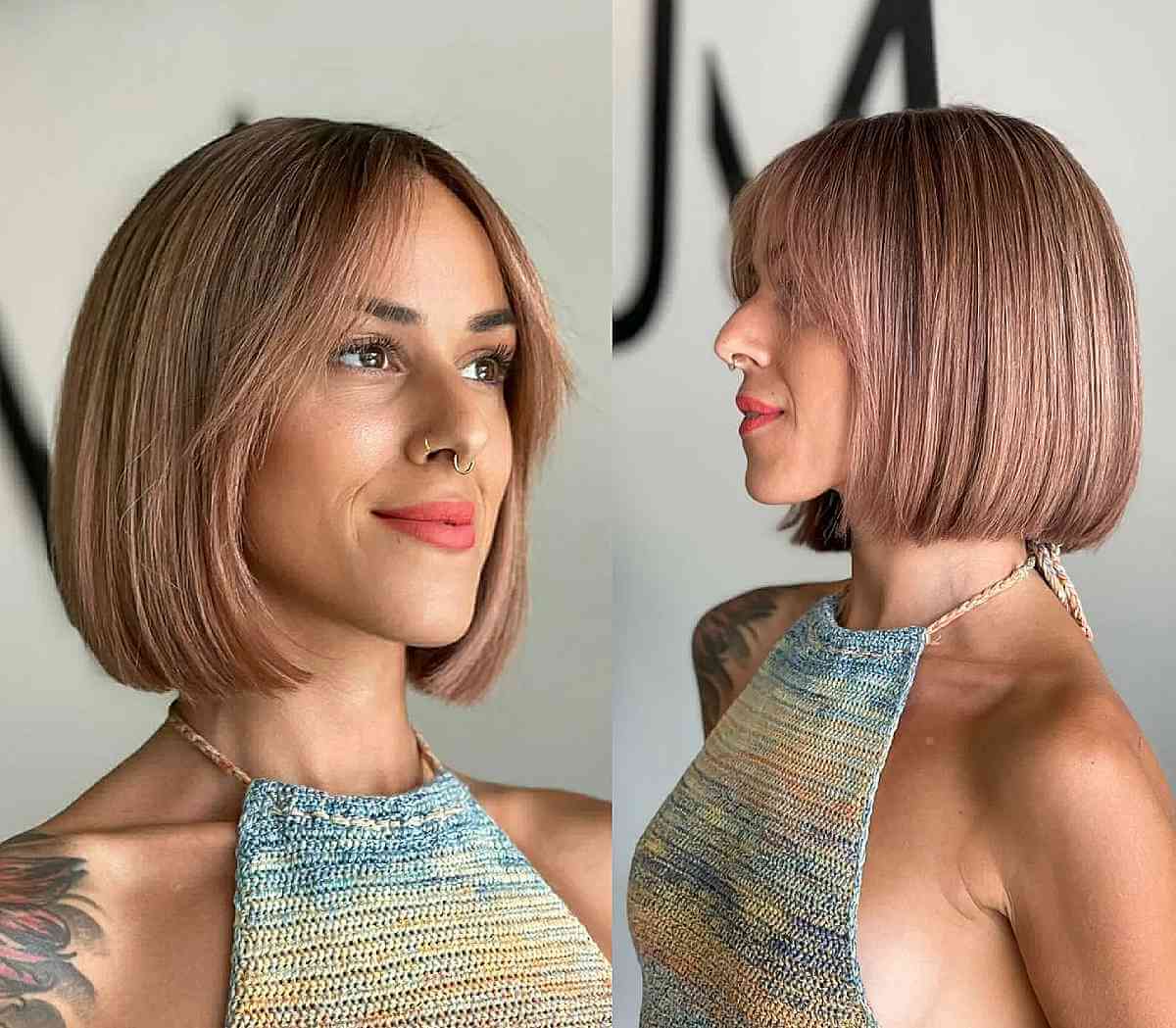 Look chic and contemporary with a rose gold blunt bob. Bobs are incredibly versatile and can be tailored to your individual facial features. Blunt ends create the illusion of added volume for thicker-looking locks. Incorporate a rose gold hue, and you’ll be in vogue.