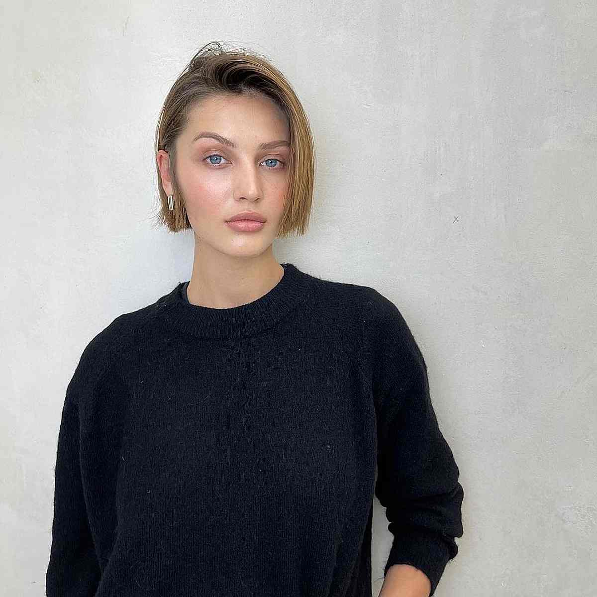 Here’s a stylish super short bob where the edges land right at the jaw area. This chop is ideal for ladies with a rounder or an oval face shape. It provides the illusion of a more defined and sharper jawline. Additionally, this sleek short blunt bob cut does a fantastic job of making fine tresses appear fuller than ever!