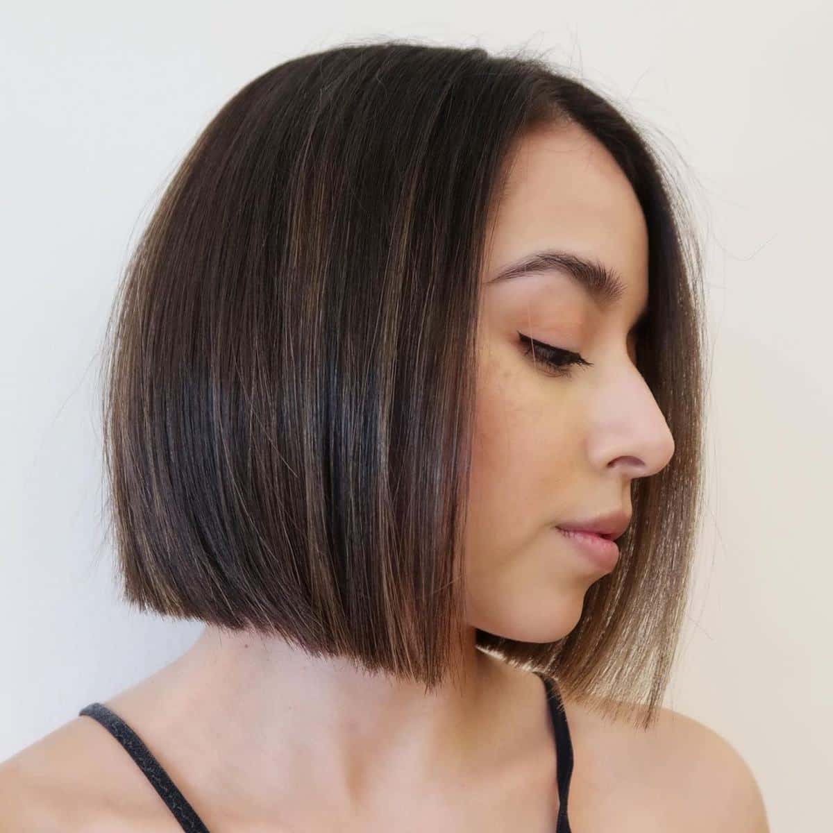 Consider this chic extra short blunt bob cut. It’s a highly sophisticated style for professional women. A blunt perimeter will create the most fullness. Ideal for fine to medium hair textures. A perfect balance for triangle, heart, and oval face shapes is a blunt cut hairstyle around the jaw and neckline.