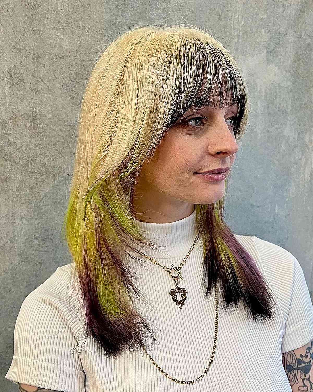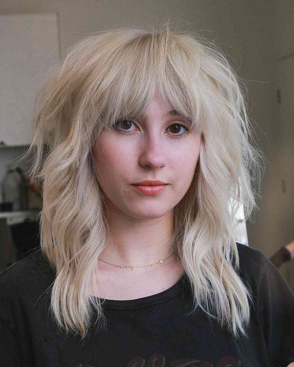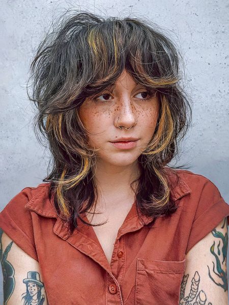 Become a trendsetter with a vibrant blonde layered wolf cut. A wolf cut is fantastic for women with medium to thick hair density. With multiple stacked layers, your hair will possess plenty of volume and texture. A wolf hair cut with bangs does require some styling.
