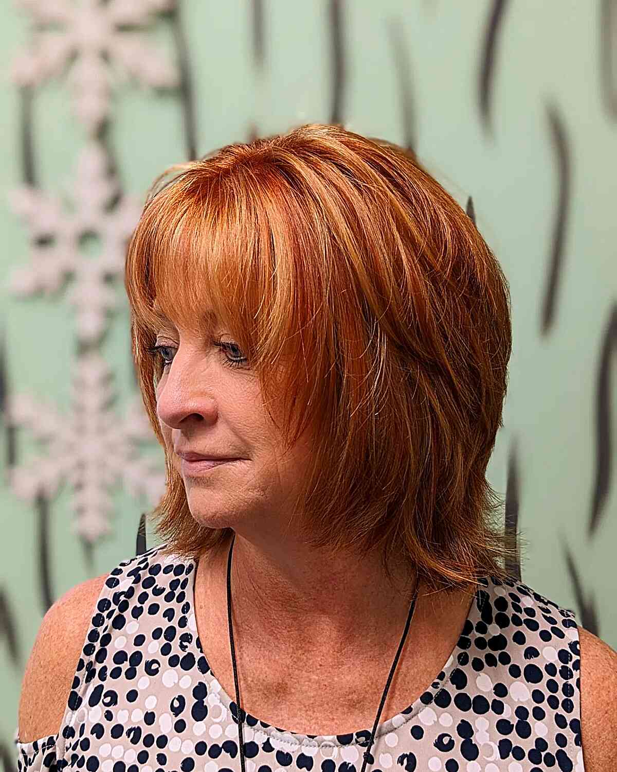 Ask for a bold red layered shaggy bob with golden highlights. I’ve discovered that crown layers really enhance the shag’s appeal. Spend time with your stylist. Decide how much volume your face shape needs to harmonize your profile. Both make a significant impact in selecting layer options.
