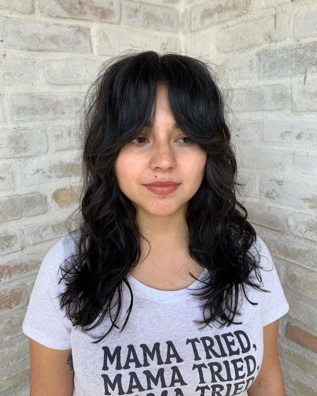 This is a long layered shag haircut featuring a curtain fringe. The key is to determine where you’d like your fringe to fall to enhance your best features, such as cheekbones or lips. This style can also be utilized to elongate a round face, shorten an oblong face, soften a square face, or balance a heart-shaped one. The cut is adaptable and can be air-dried for a playful beachy look or styled with a blowout and curls for a soft, flowing appearance. The ideal products for this look include salt sprays for a lovely full crown, curl creams for luscious, defined curls, and oils for frizz control and shine.