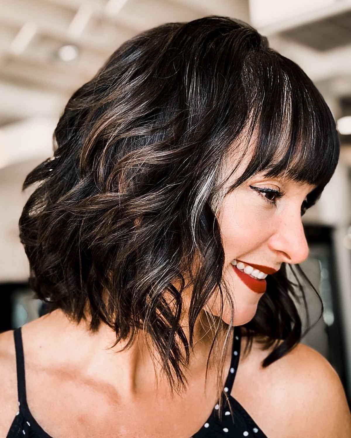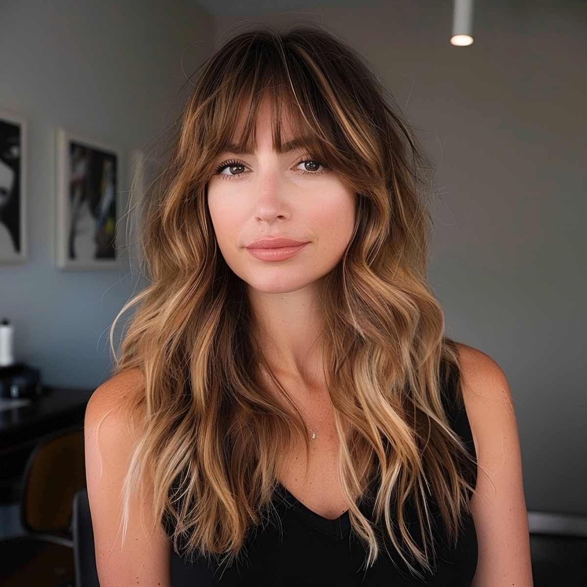 Wavy brunette bangs are a fantastic option to create more dimension in your long hair. Consult with your stylist to accentuate your features while considering your individual head and face shape. This can greatly improve your hairstyle and color.