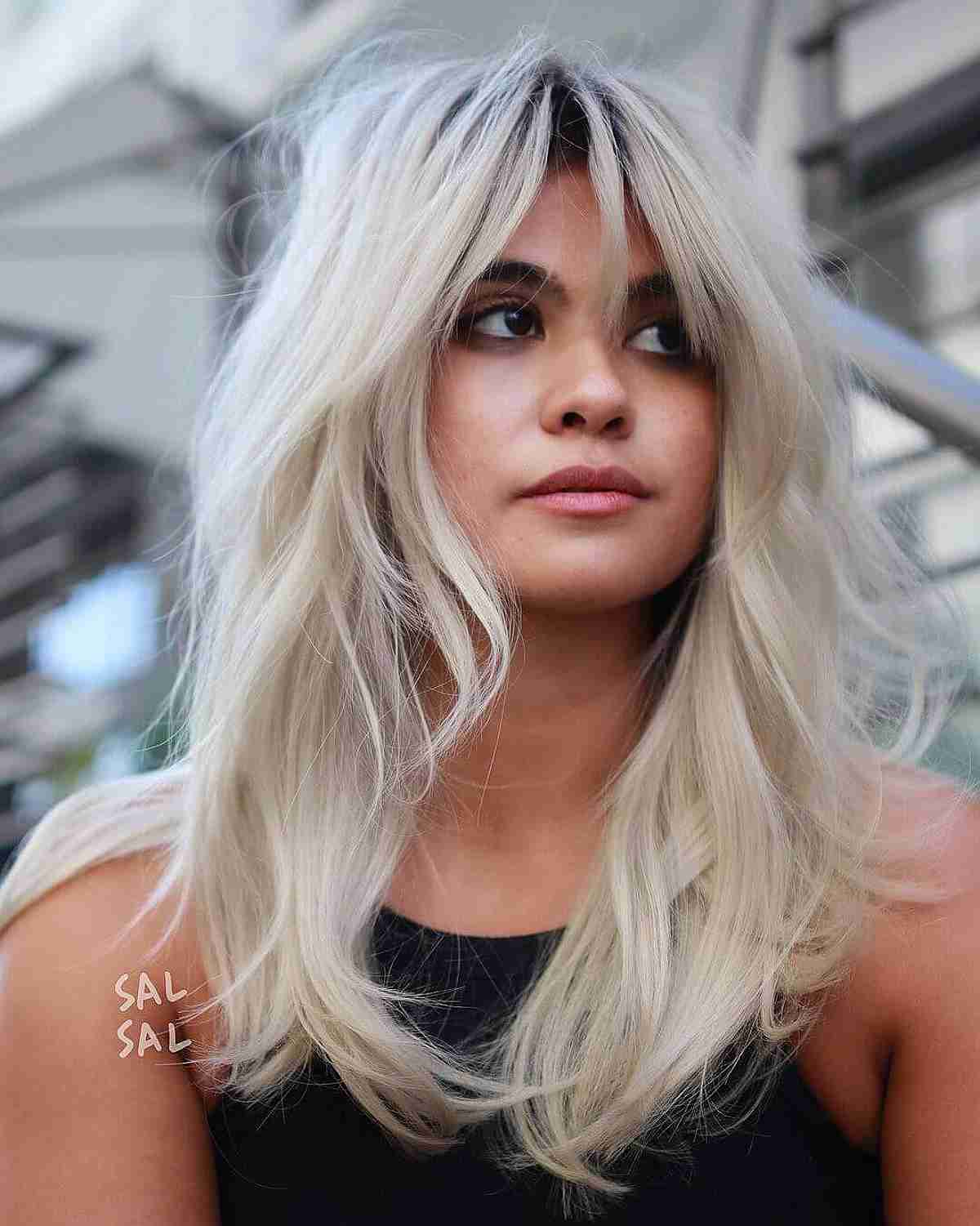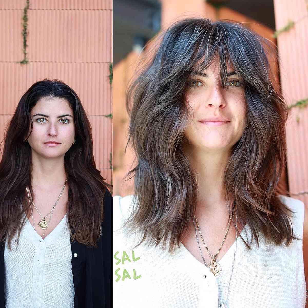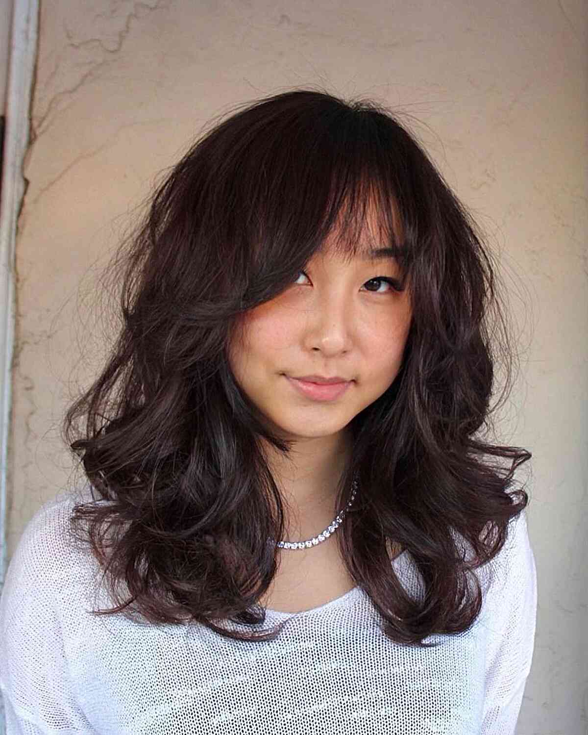 Choppy bangs on medium-length layered thick hair offer a fantastic option for women seeking a hairstyle that reduces some of the bulk and heaviness of their hair. For thick hair, one of the most effective methods to prevent it from feeling so heavy is by incorporating layers. This not only brings shape and movement to your hair but also helps your ends appear and feel significantly lighter. Request your stylist to utilize thinning shears or a razor to introduce varied lengths and softness to the ends of your hair and layers.
