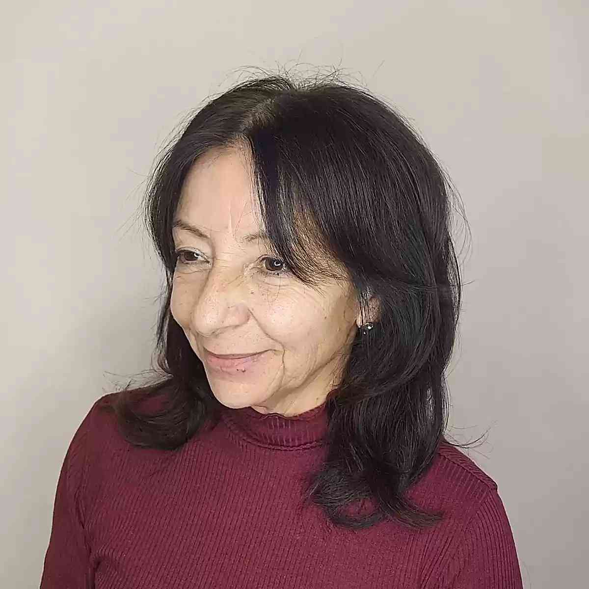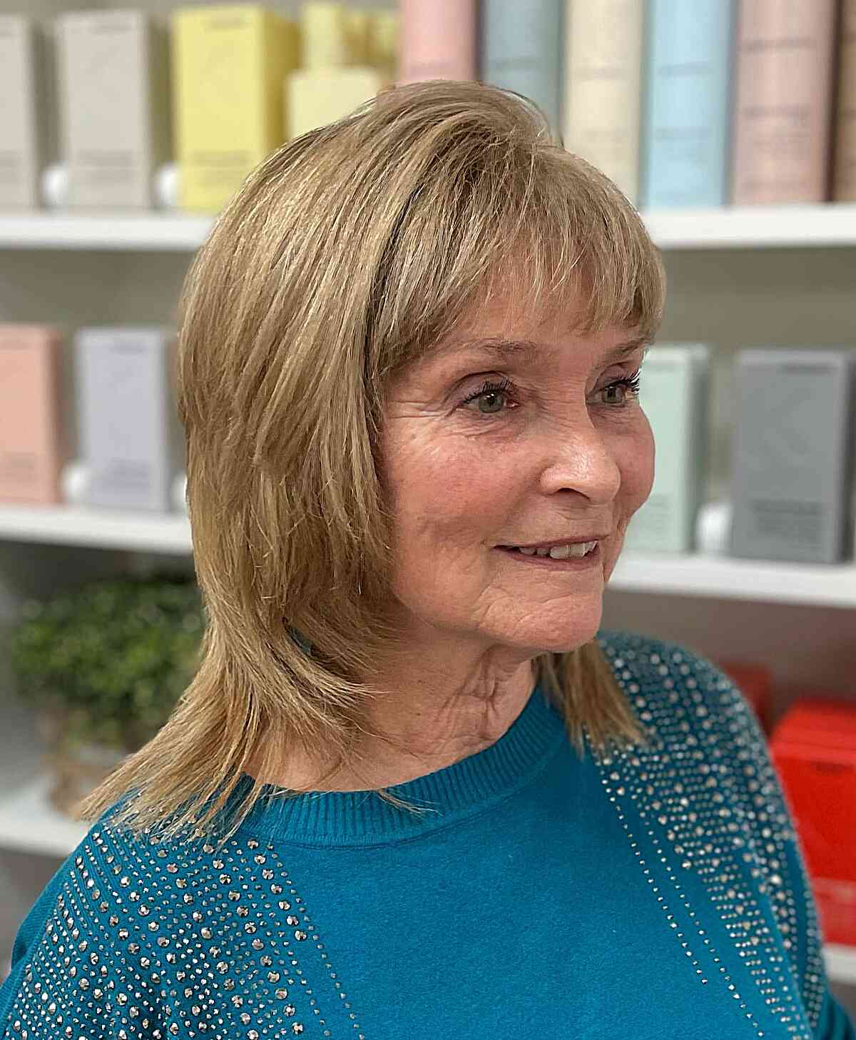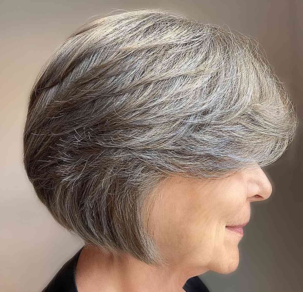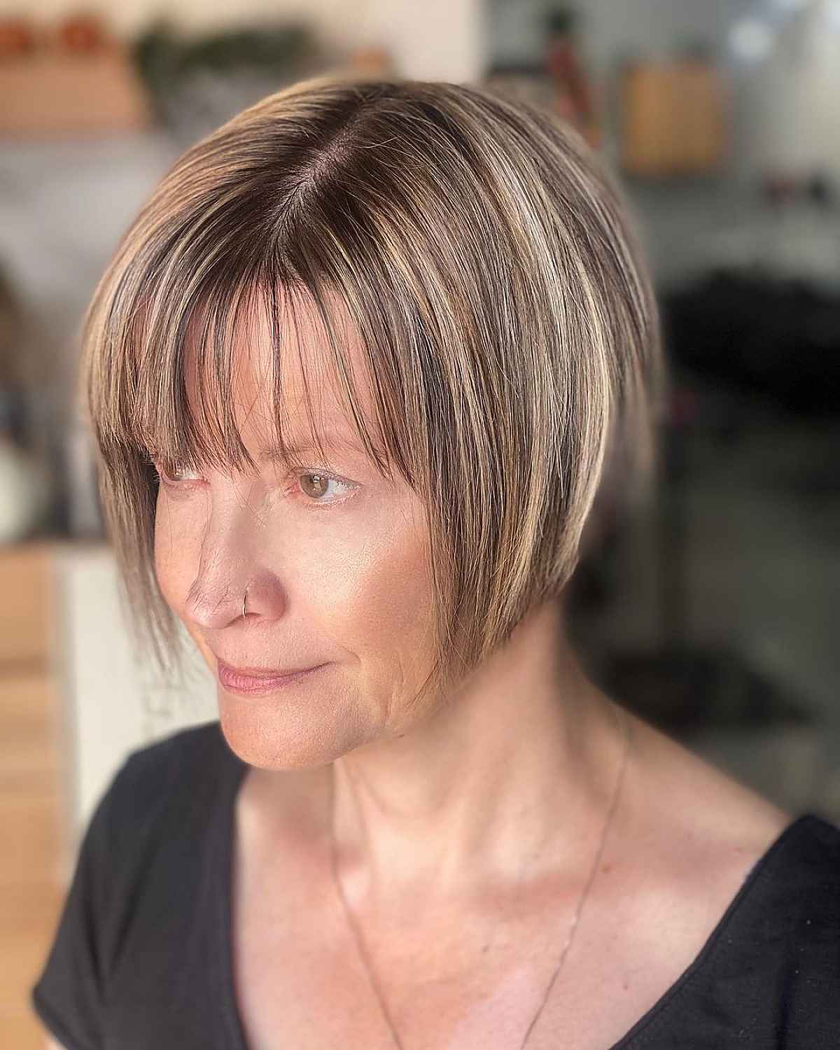 This layered bob with bangs is a fashionable option for older women seeking a stylish yet practical haircut. The soft, wispy layers add movement and texture, giving the hair a fuller appearance. The bangs frame the face beautifully, making it an ideal cut for those with fine to medium hair density. The subtle highlights enhance the overall look, making it contemporary and fresh. This cut is particularly flattering for women with glasses, offering a youthful and sophisticated style that’s easy to maintain.