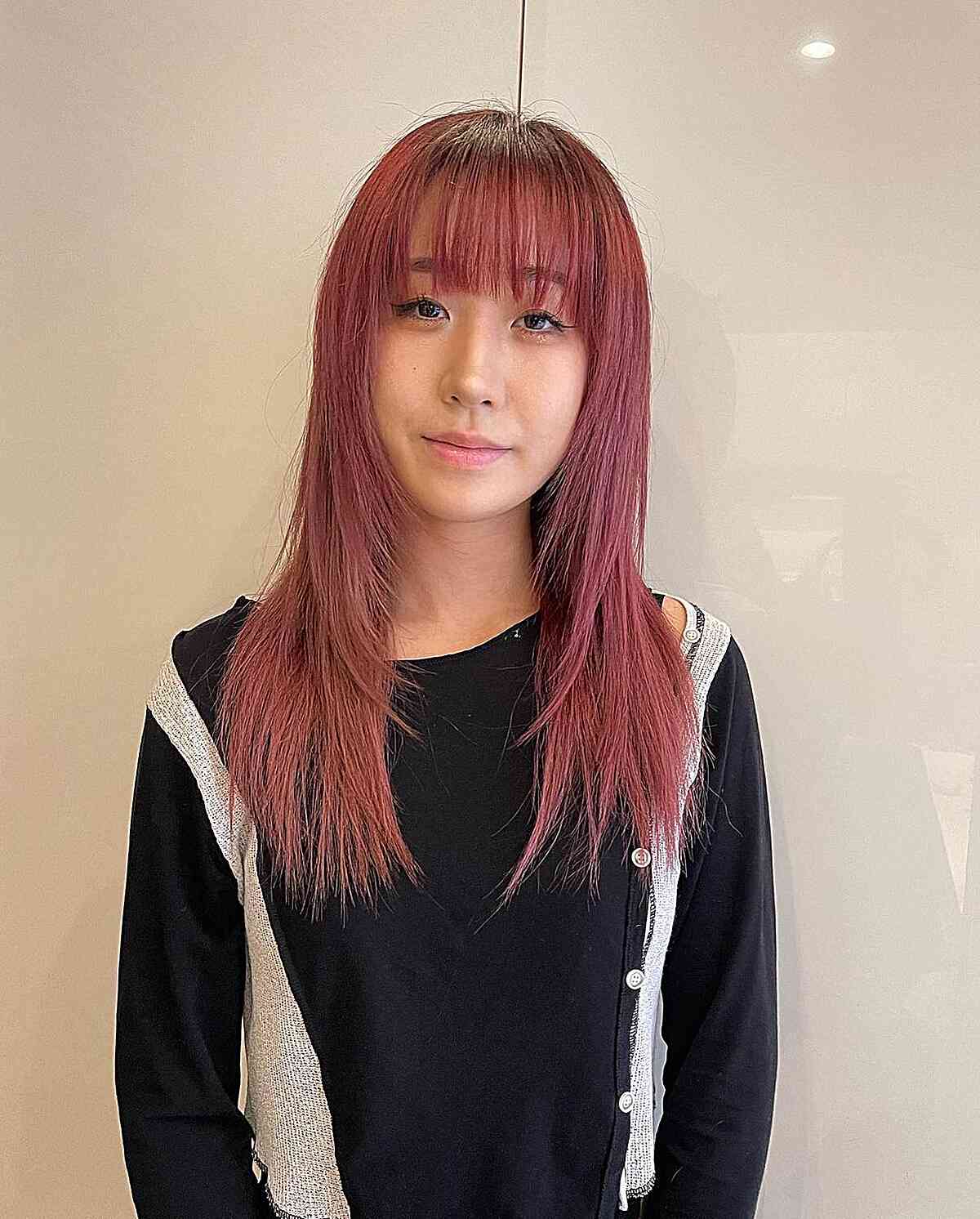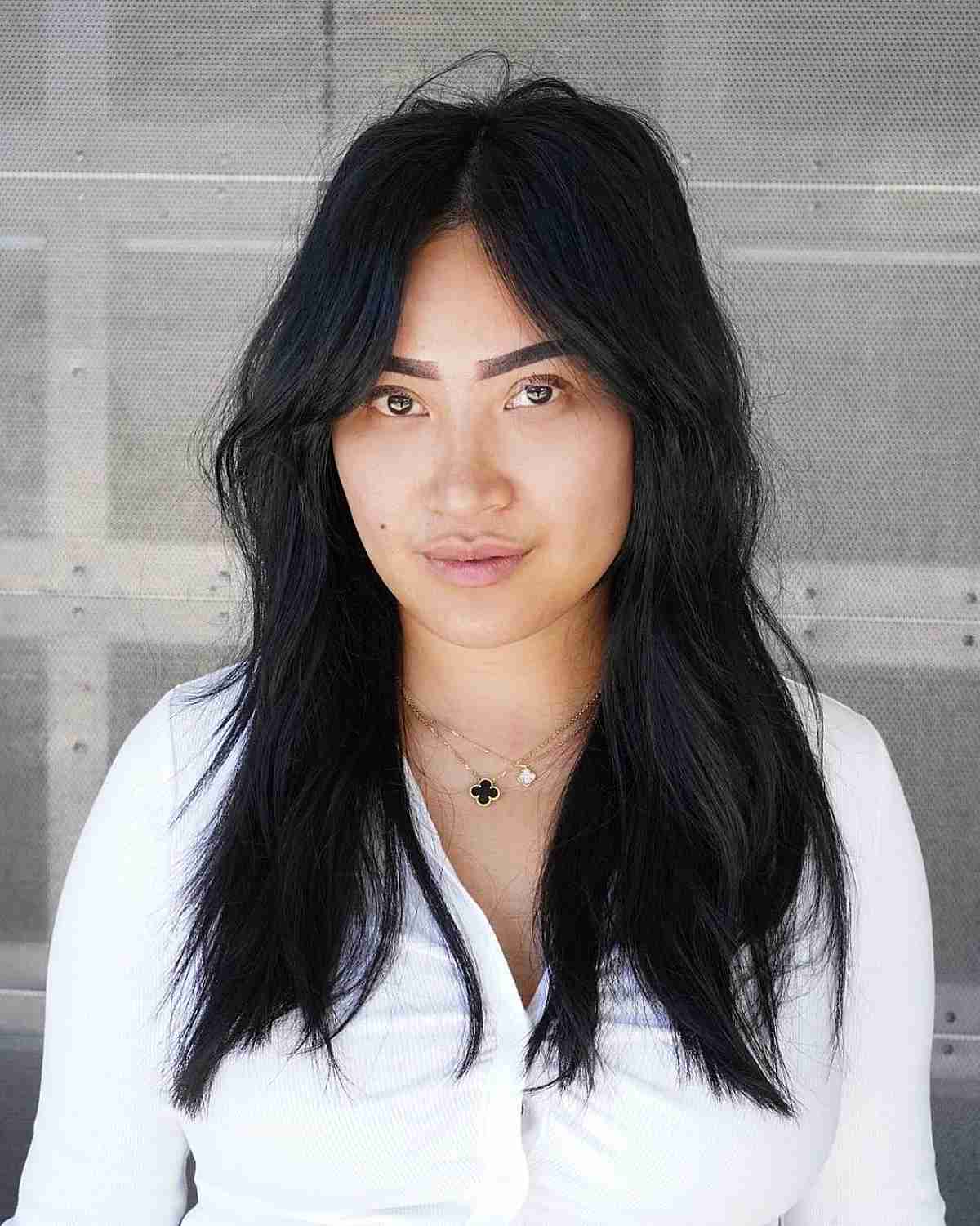 Sleek layers paired with waterfall bangs exude a modern vibe. Inform your stylist to give you a razor or point-cut face frame. Additionally, request a jagged fringe on your medium to long hair. Light, textured layers complement a waterfall fringe. This fringe features choppy lengths of varying sizes. Combined, these elements create a gentle appearance that aligns with a minimalist aesthetic.