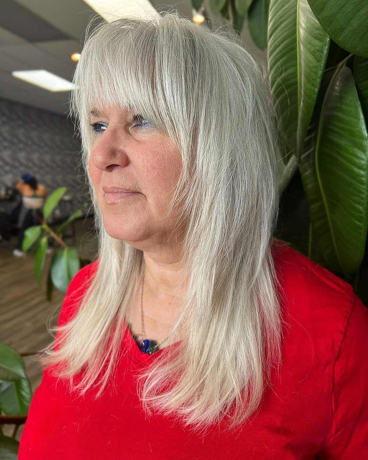 This layered hairstyle with bangs is typically low-maintenance while still looking fabulous. The cut is feathered at the ends, highlighting the beautiful gray highlights and those feathered layers.