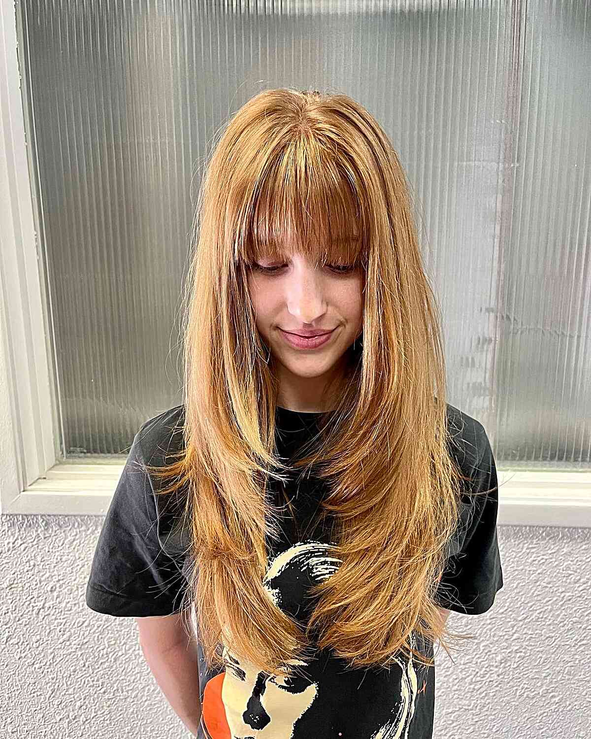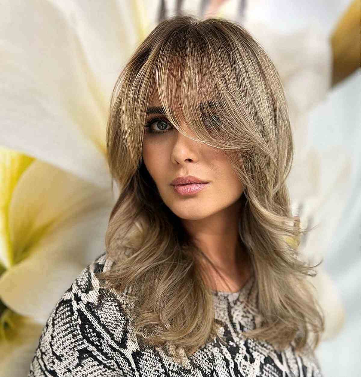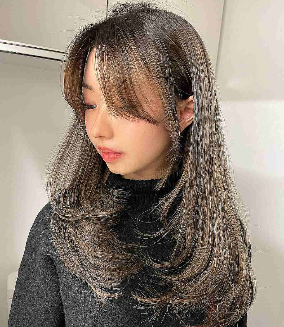 These extended layers with soft bangs are striking and contemporary. Ask your stylist for a hairstyle with bangs that elegantly frames your face. For a more stunning effect, consider adding some vibrant highlights or balayage. This adds texture and depth. When discussing this hairstyle with your hairdresser, mention extended and soft.