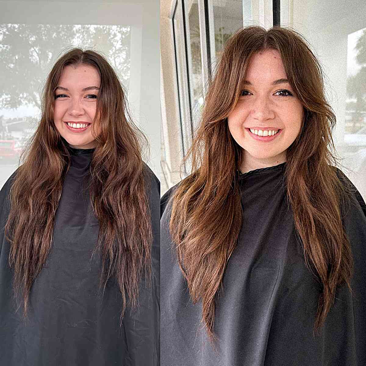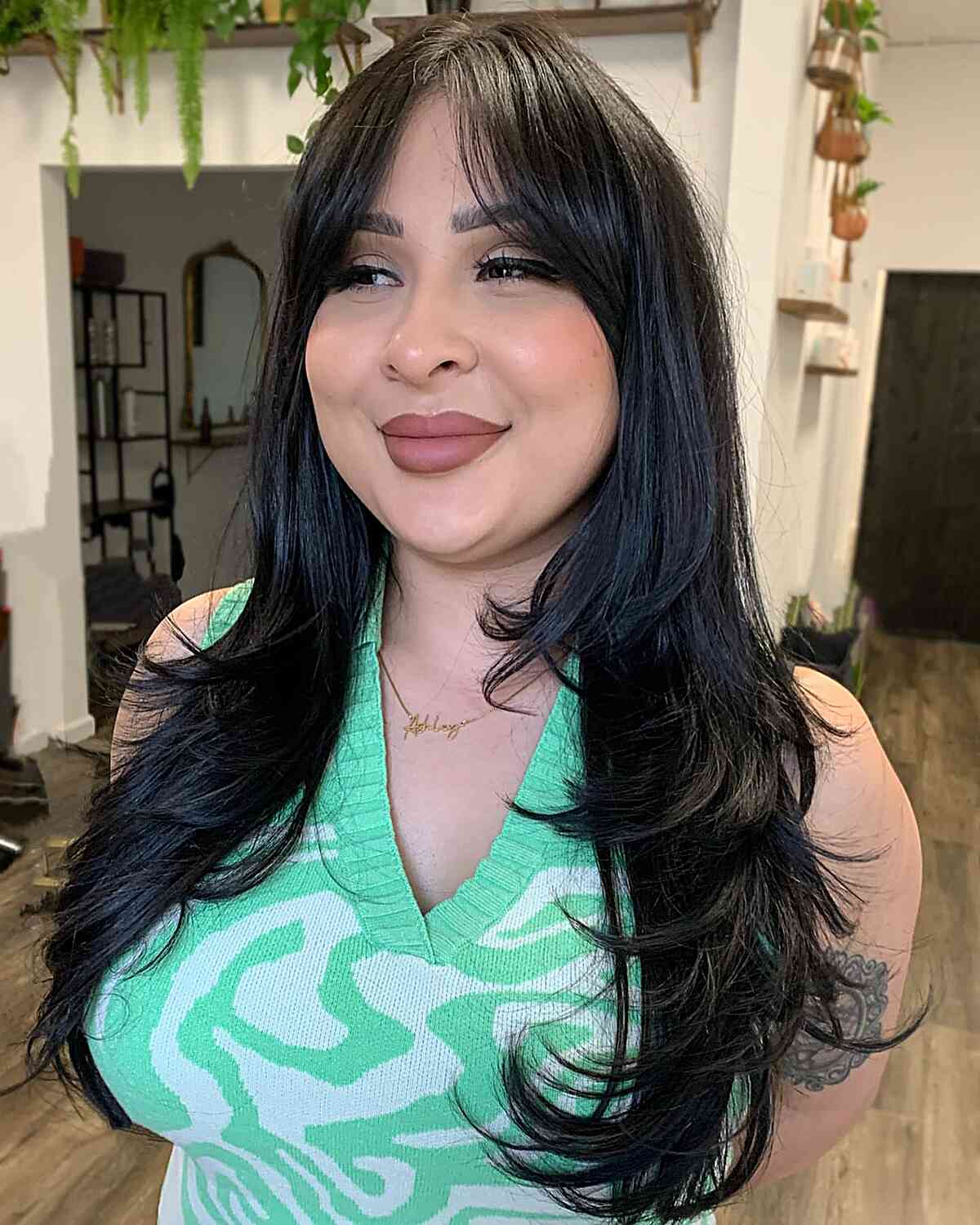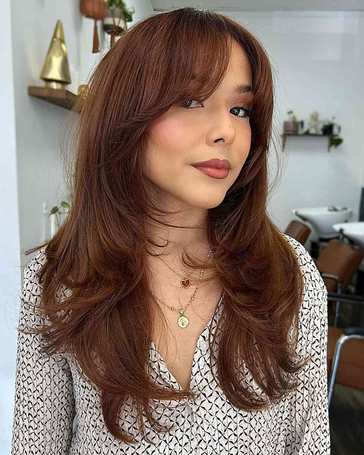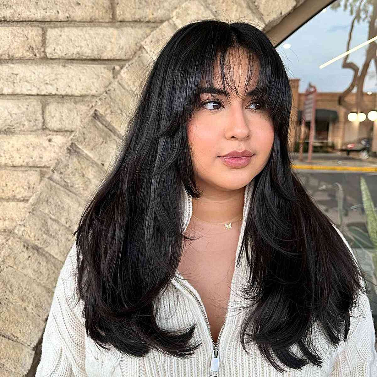Consider a chic long layered haircut with bangs for a total glow-up! This stylish haircut is effortless to style and shines on a tousled mane. It features a longer, wispy fringe. For added depth, feel free to request a balayage as well!