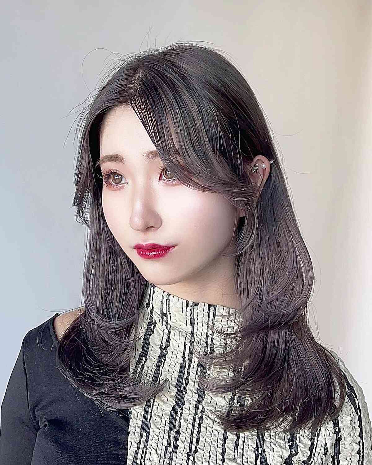 Perfect for those seeking depth, this chic platinum icy layered cut on medium-length hair brings a stylish flair. Notice the sweeping fringe that highlights high cheekbones and the soft body waves that enhance texture. Ideal for medium to thick hair, the platinum shade will require upkeep and is best for those prepared for regular salon visits for color maintenance. While it provides dimension, be aware that icy shades can be a journey for darker hair types and necessitate additional care to uphold hair integrity.