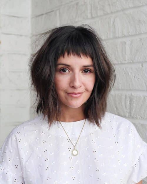 Go for chic short layered hair with bangs that is a casual bob with a thin straight fringe. These short layers are a fantastic and simple way to elevate this casual hairstyle.