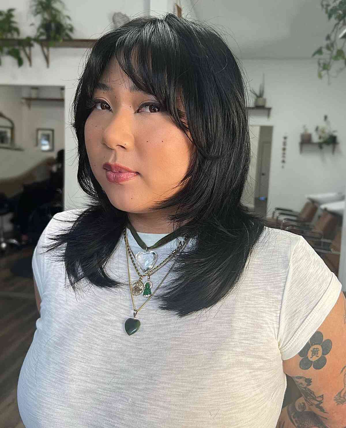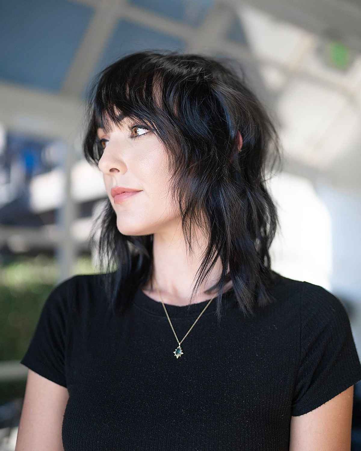 #35: Chic Jet Black Shaggy Layers with Curtain Bangs
