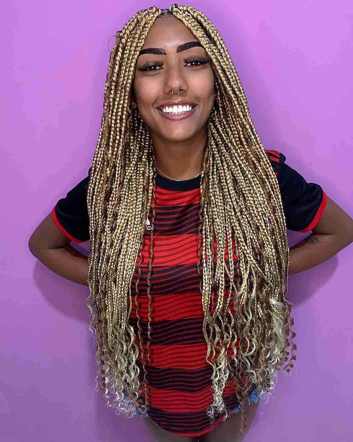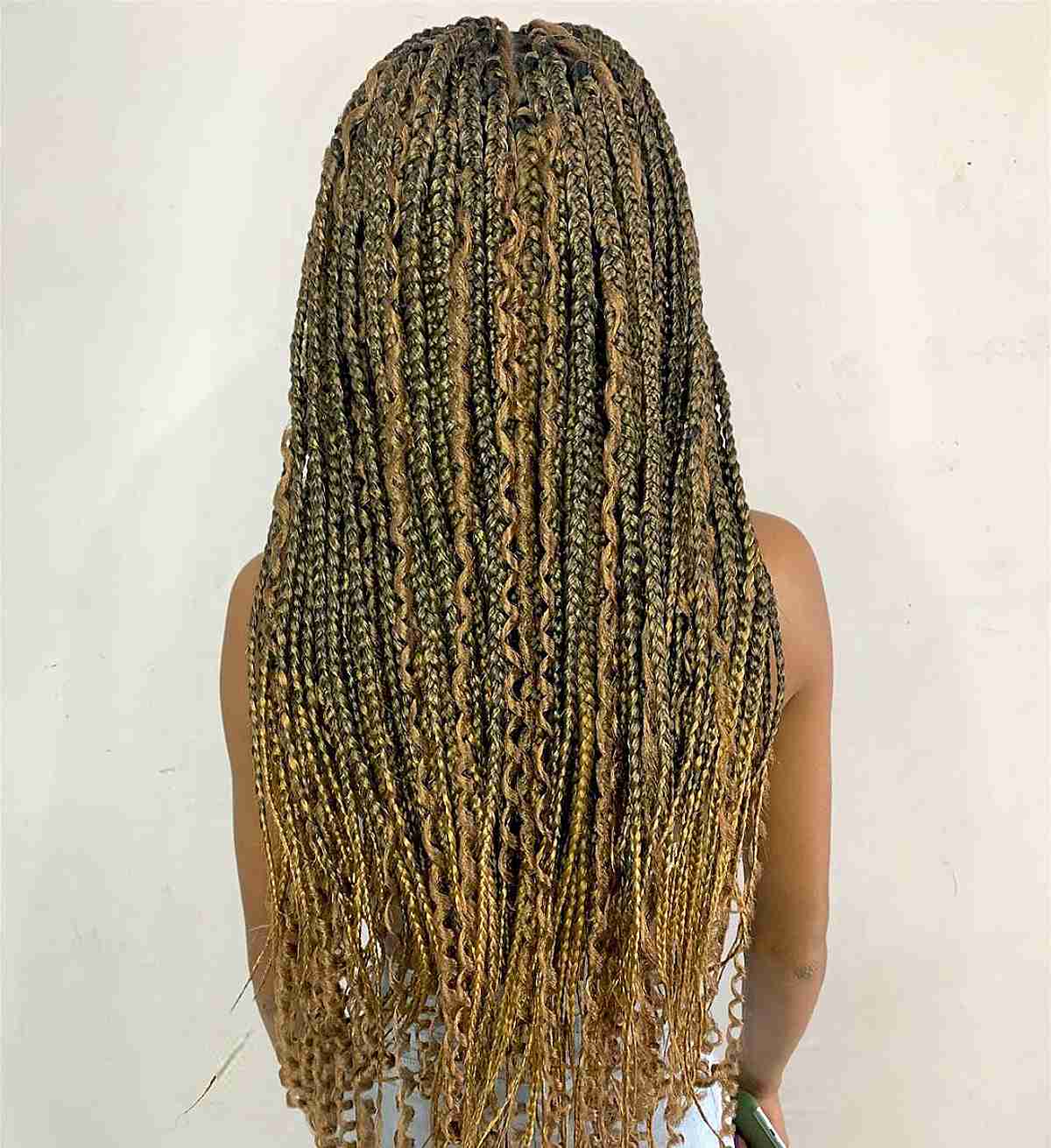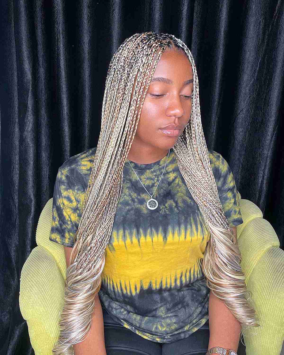 Consider mini goddess braids if you are prepared to spend some time in the braid chair. Due to their small size and timeless appeal, completing them does require a bit of time. However, the style endures for quite a while. Knotless mini braids are typically more comfortable than traditional box braids. Therefore, ask your braider for the knotless option of box braids. You’ll also want to show them images of the blonde shades you’re interested in, as there are numerous variations of blonde available.