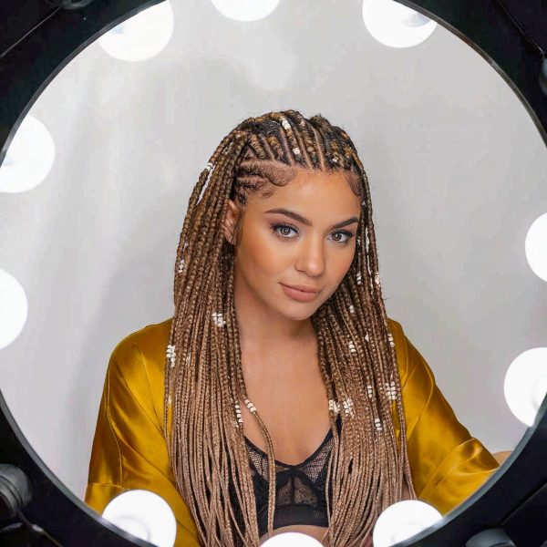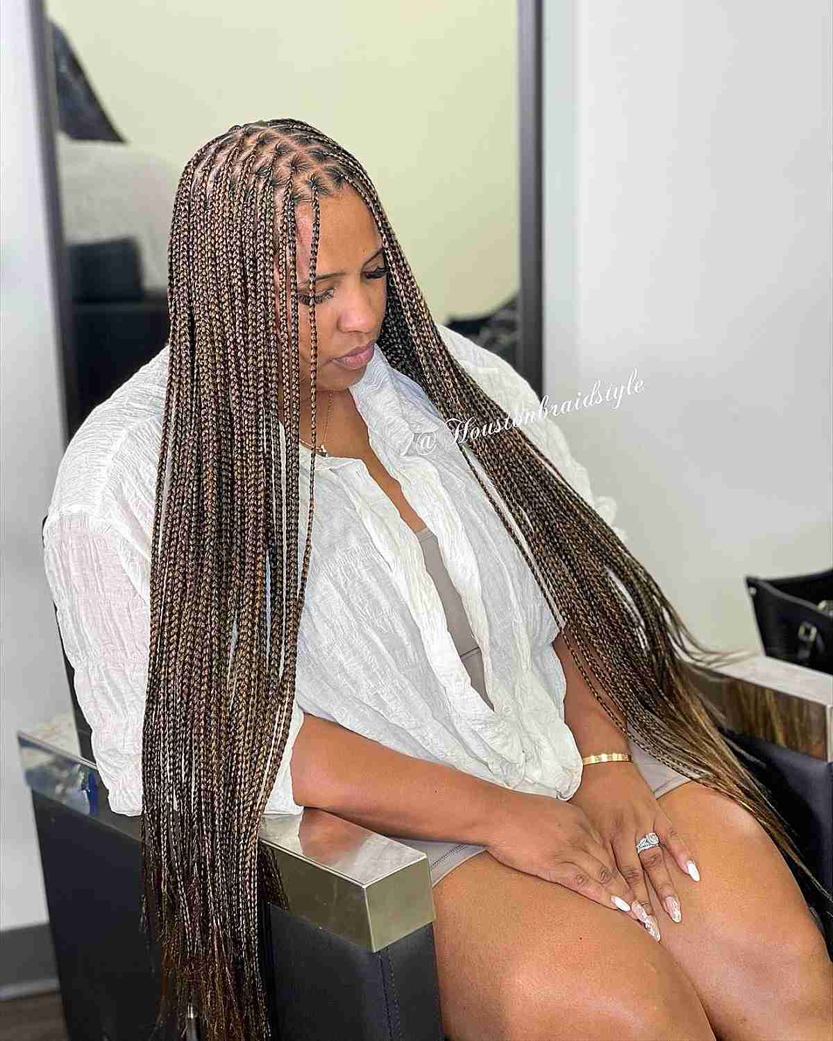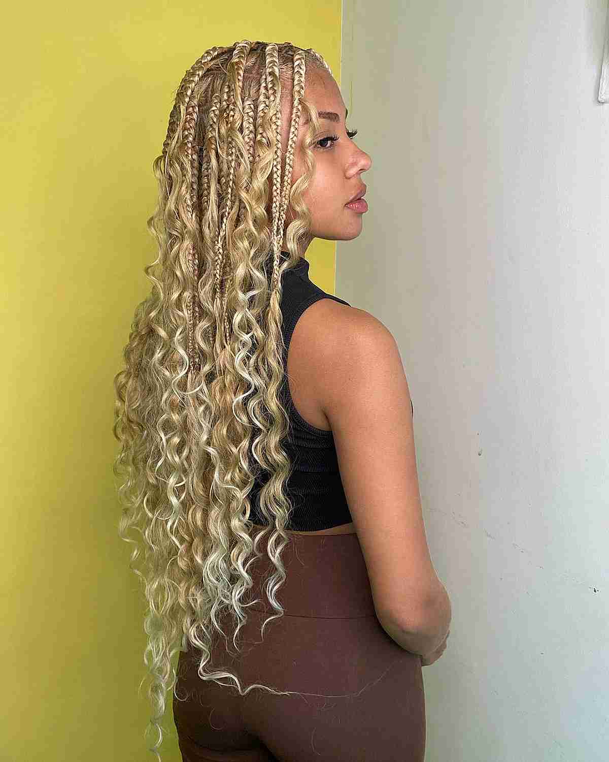 Consider mini goddess braids if you are prepared to spend some time in the braid chair. Due to their small size and timeless appeal, completing them does require a bit of time. However, the style endures for quite a while. Knotless mini braids are typically more comfortable than traditional box braids. Therefore, ask your braider for the knotless option of box braids. You’ll also want to show them images of the blonde shades you’re interested in, as there are numerous variations of blonde available.