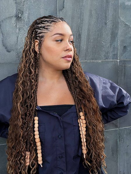 Box braids and curls on dark hair represent a trendy braid option for young adult women. It’s fun, flirty and can be styled with various curl patterns and shades. The curls can be integrated throughout with either crochet hair or human hair. I recommend a human hair blend to be styled with heat and product as necessary.