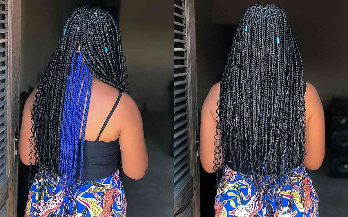 A playful twist on incorporating color into your braids is black and blue peekaboo divine braids. When you swing your braids around, your hair will catch the eye and reveal a striking blue. The beauty of these peekaboo braids is that you can select any hue you prefer to express your mood and personality.