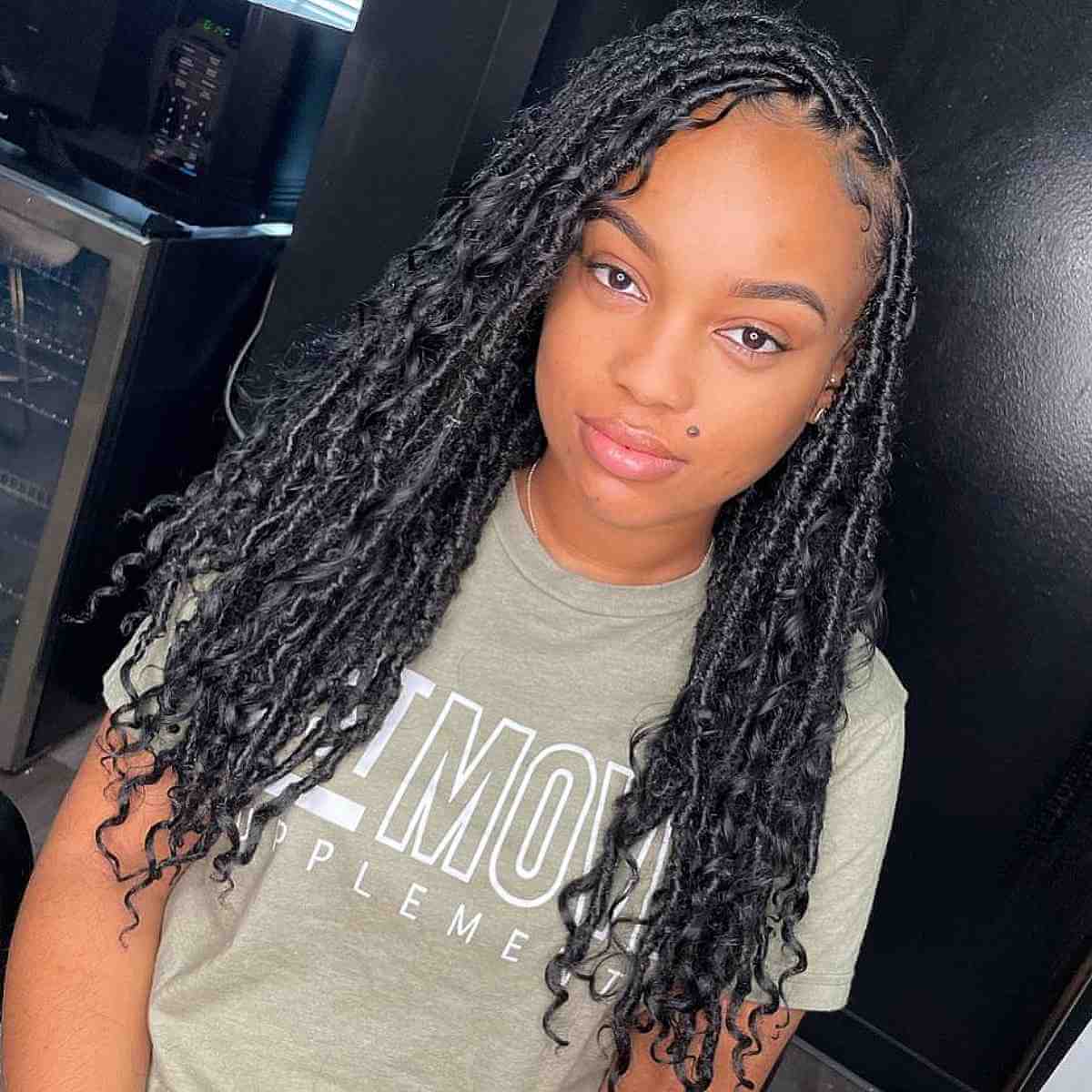 Chic boho braids or boho faux locs are an excellent protective style for dynamic young women who are always on the move. Added loose curls throughout will create a goddess hairstyle from the boho vibe. What’s great about this style is its durability and requires minimal upkeep. The older this style gets, the more natural the faux locs or messy braids appear.