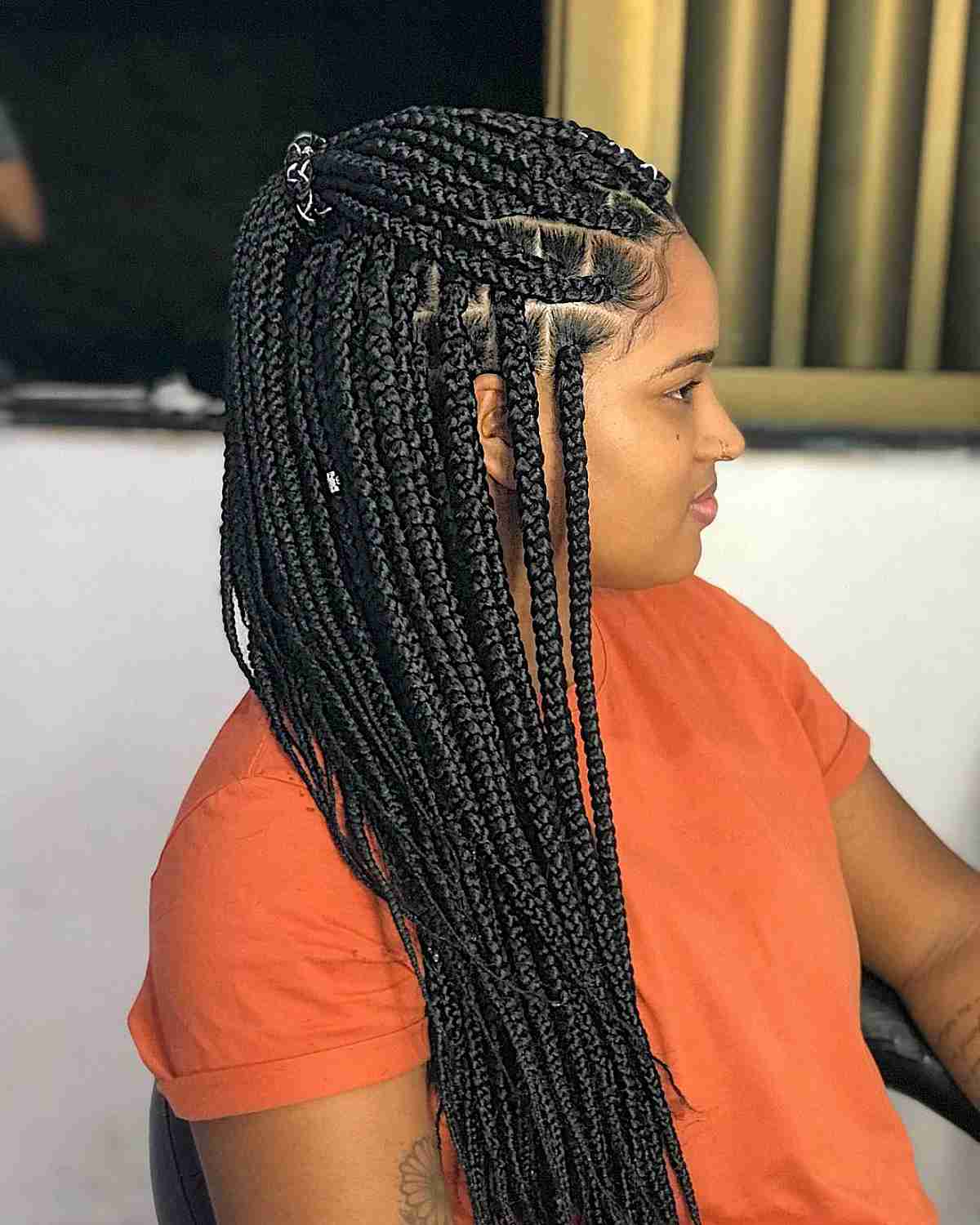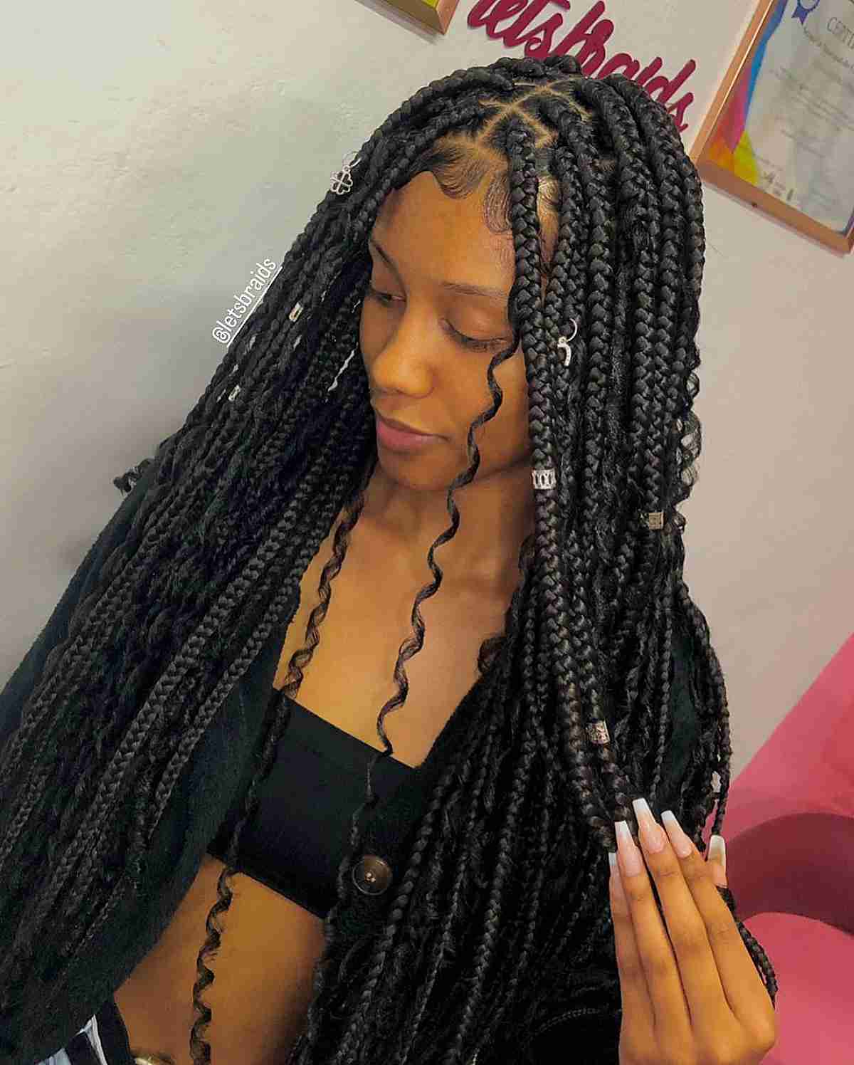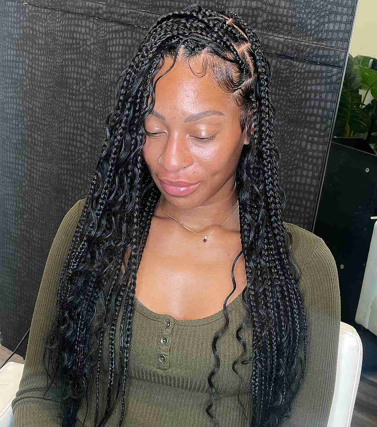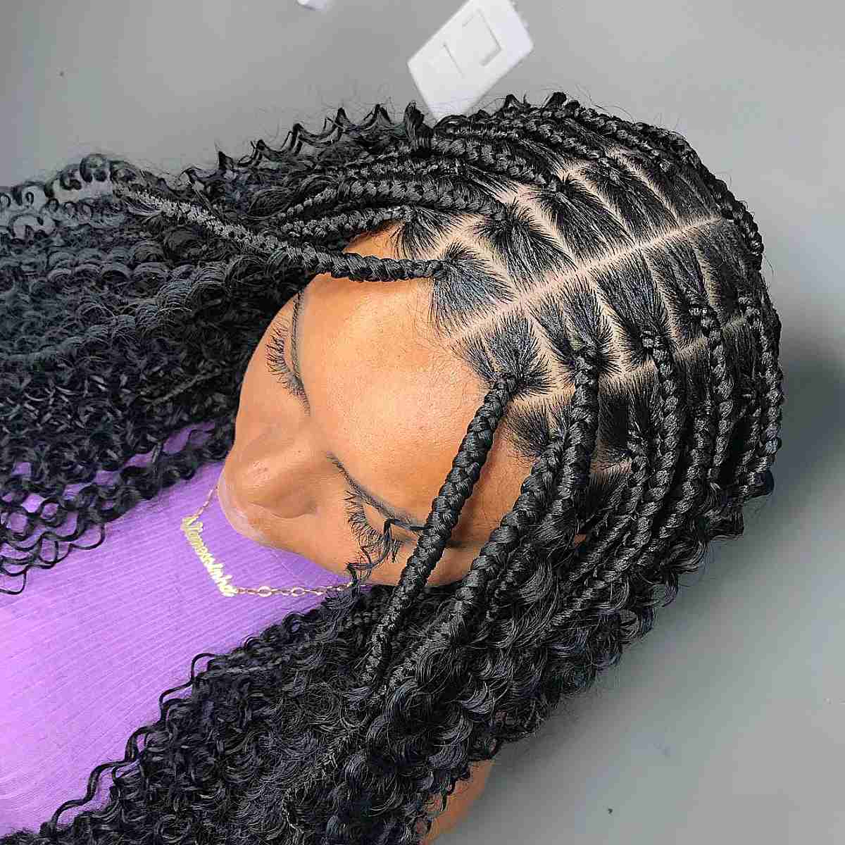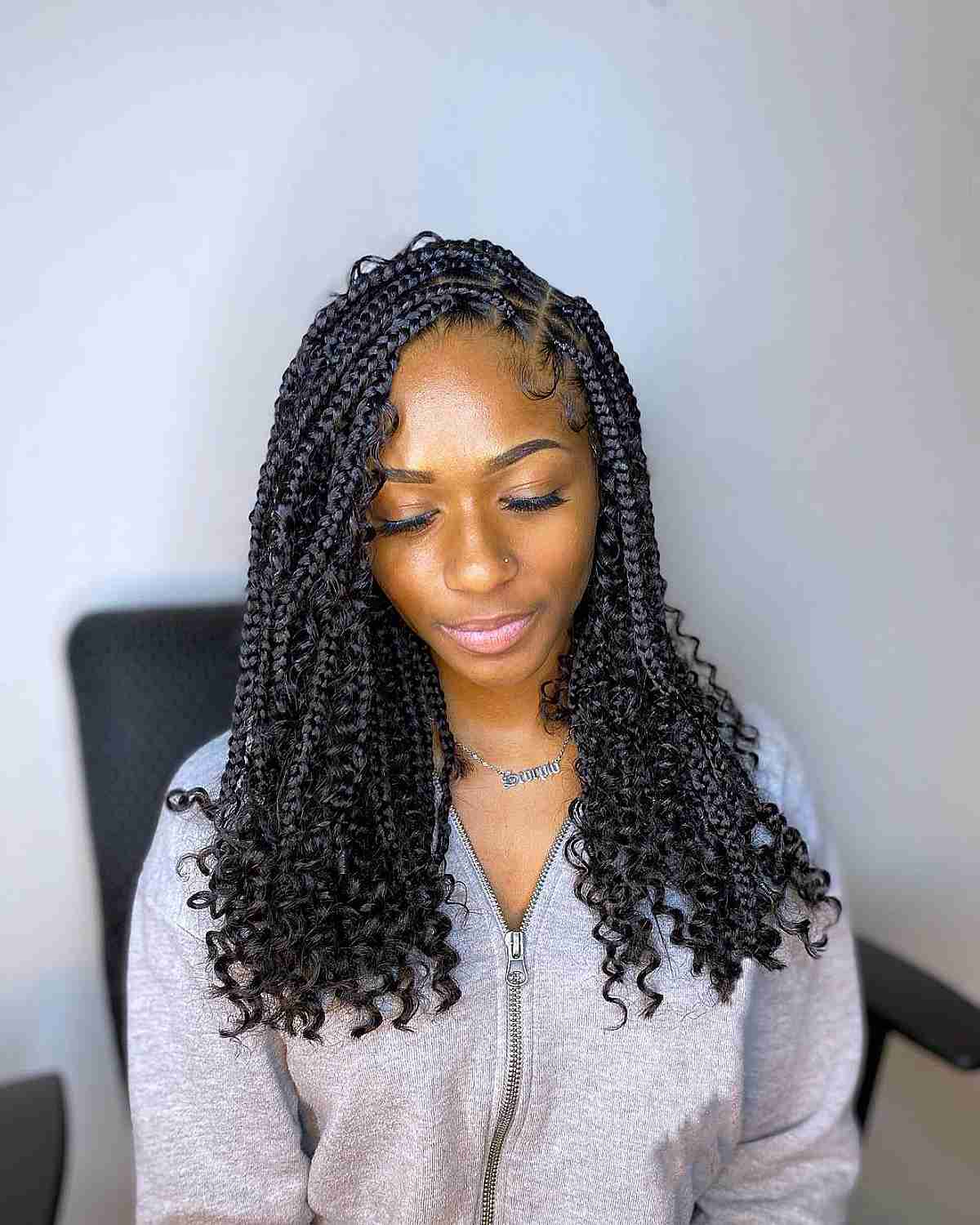 Medium-length knotless braids with curly accents present a charming take on a bob haircut for black women. Instead of traditional box braids, knotless to the scalp keeps the style light. It also allows you to style the braids to the side or center. You can elevate your look with hair accessories whenever you desire a touch of sparkle.