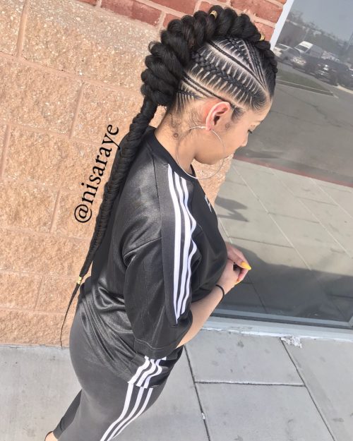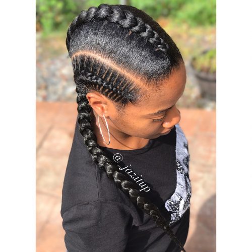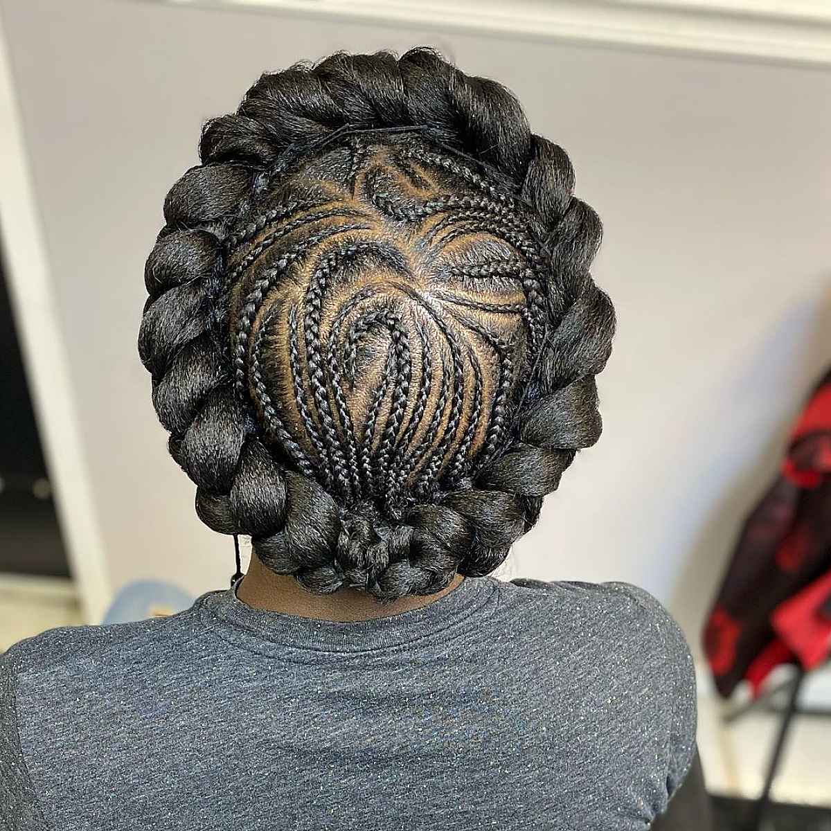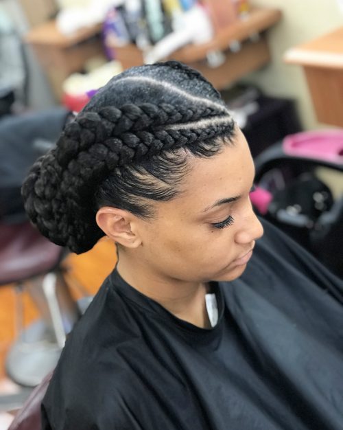 A goddess braid mohawk updo provides a sleek and refined appearance of a well-maintained hairstyle. Complete these goddess cornrows into a single braid for an invigorating and effortless vibe. I love how it conveys the illusion of a mohawk. The under braids on the sides create a smooth look reminiscent of a taper cut, while the prominent cornrow in the center adds volume. I