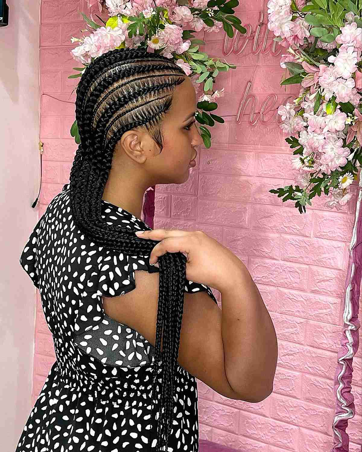 A simple cornrow look with feed in goddess braids is neat stitch braids. If you appreciate precision, combine goddess braids, cornrows, and a stitch technique that all pair well together for a chic finish.