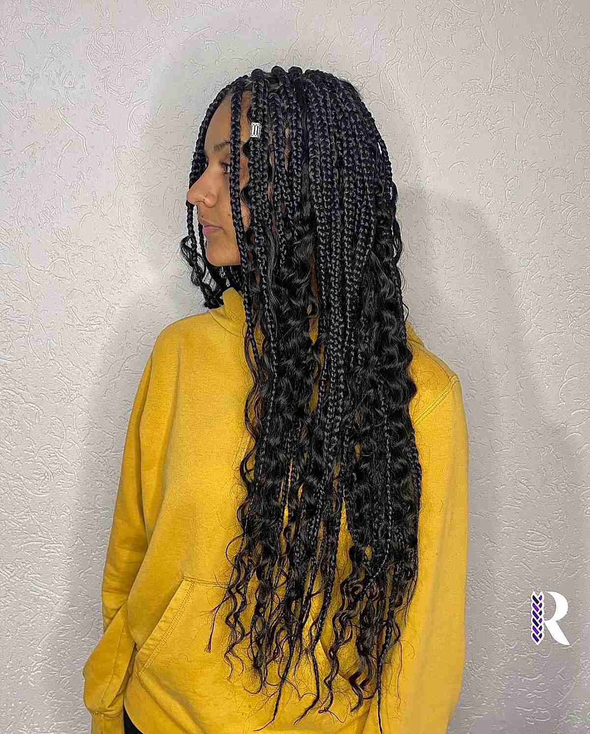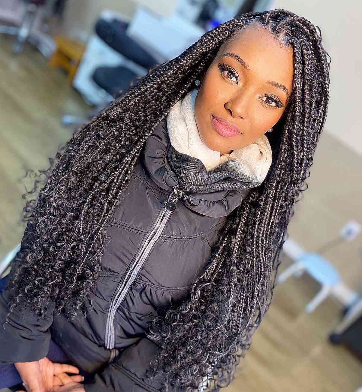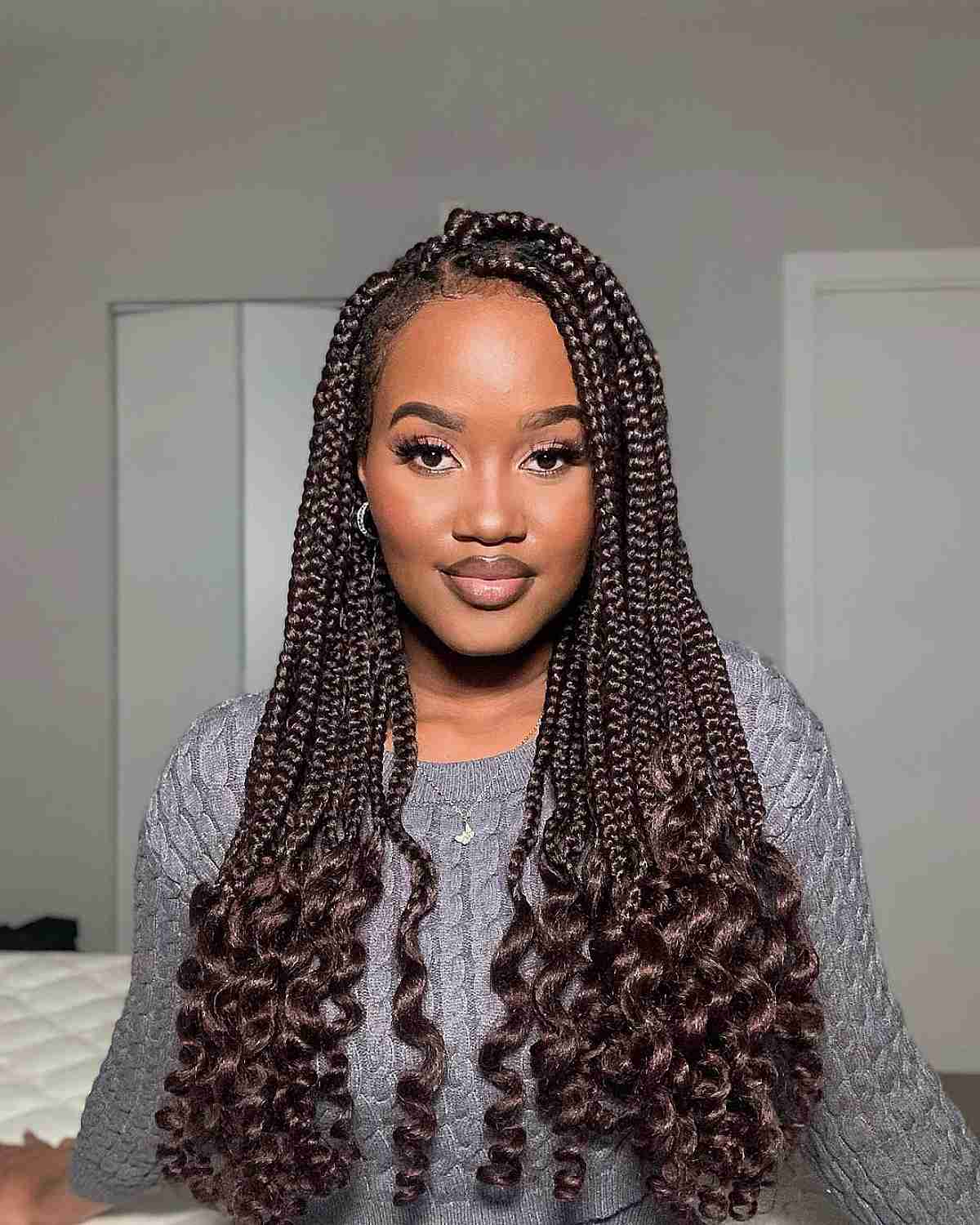 Layered gypsy box braids present an ideal fusion of curls and knotless braids. Unlike boho knotless styles, tighter curly hair is incorporated more extensively throughout the braids. This enhances the visibility of the curls significantly. Note that if crochet hair is utilized for the gypsy curls, the style may not be as enduring. Human hair remains the preferred choice.
