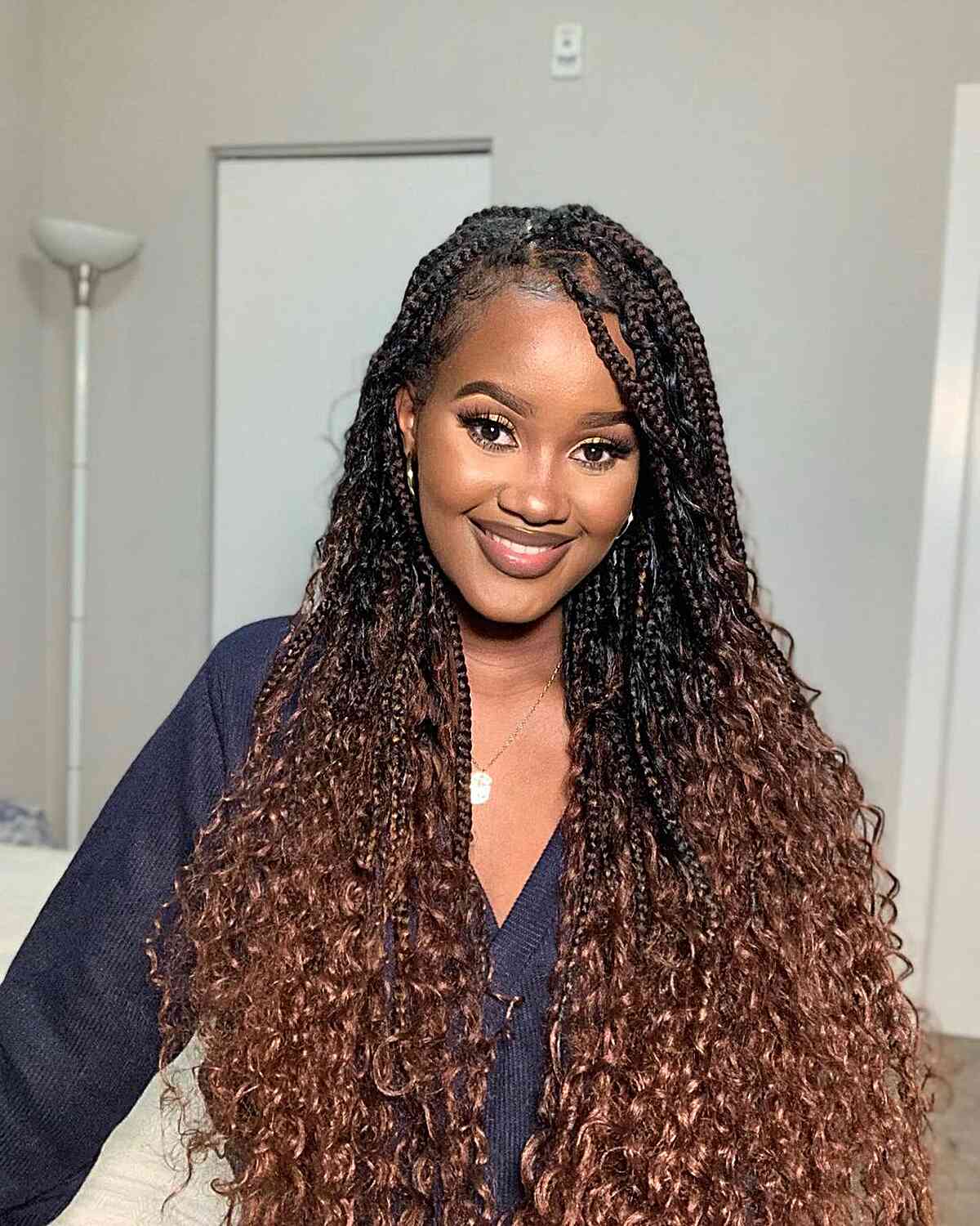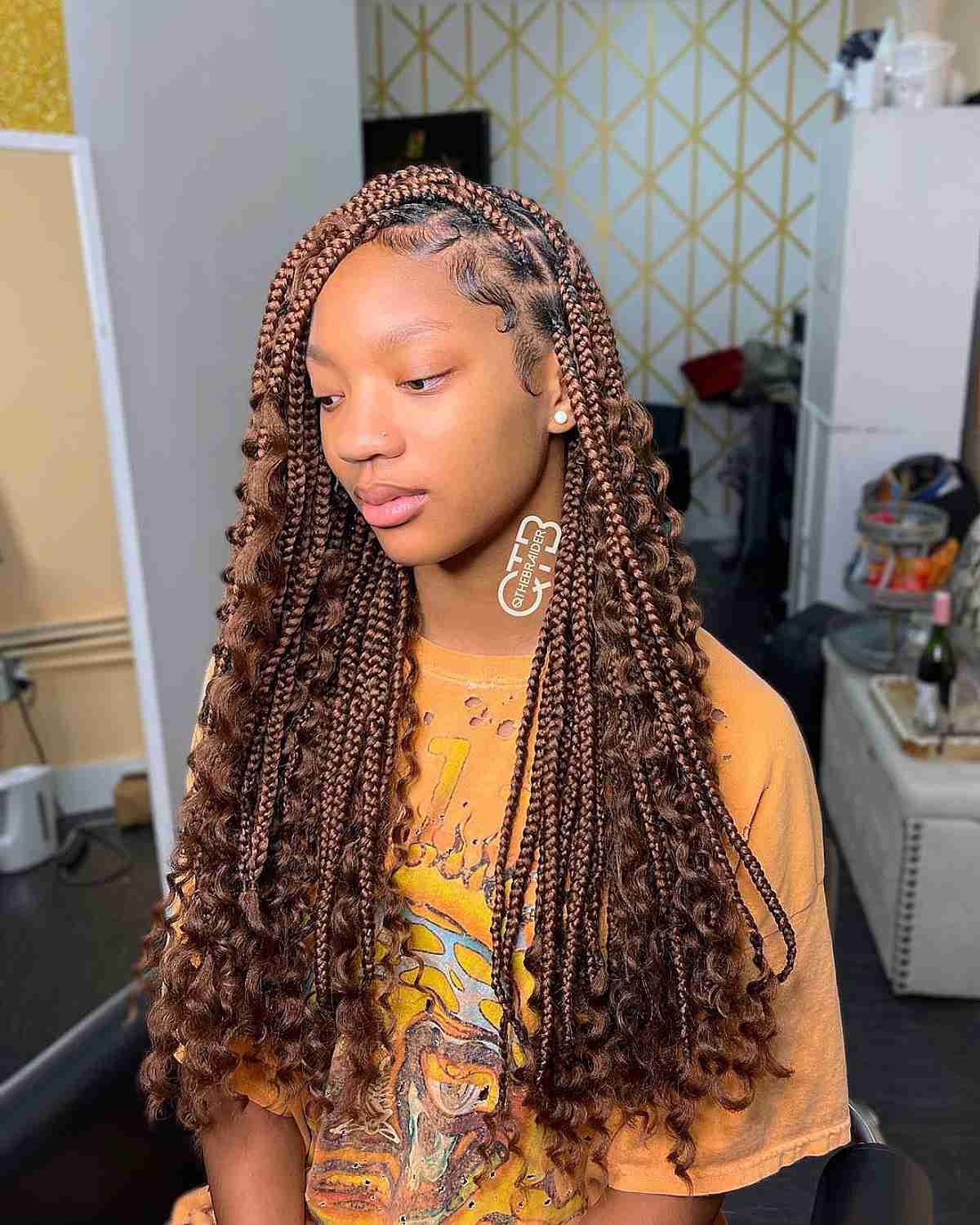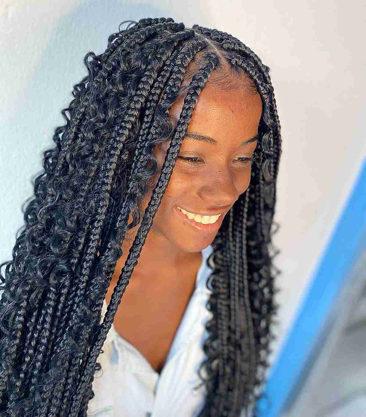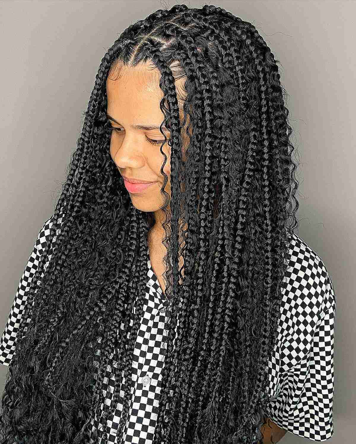 Layered gypsy box braids present an ideal fusion of curls and knotless braids. Unlike boho knotless styles, tighter curly hair is incorporated more extensively throughout the braids. This enhances the visibility of the curls significantly. Note that if crochet hair is utilized for the gypsy curls, the style may not be as enduring. Human hair remains the preferred choice.