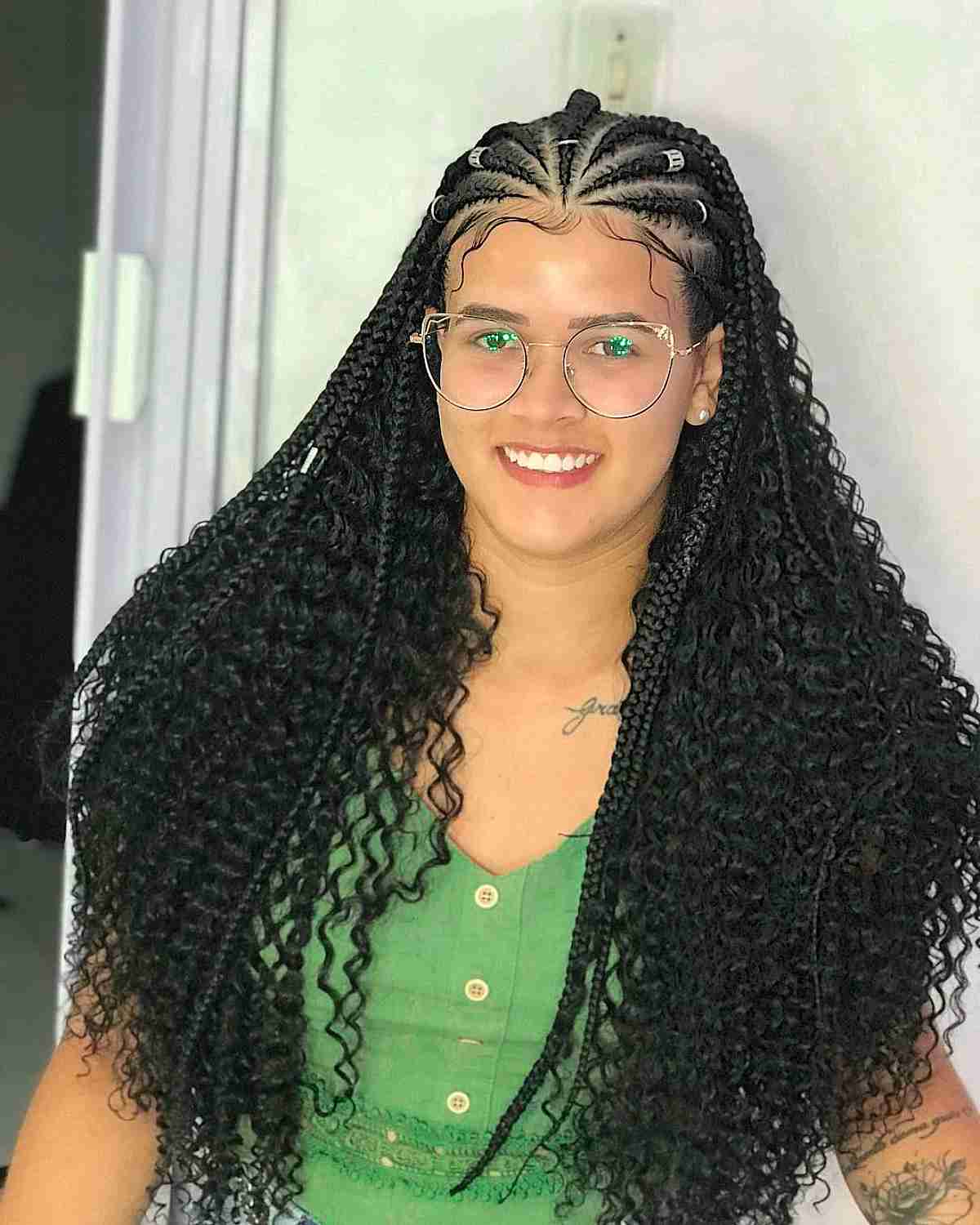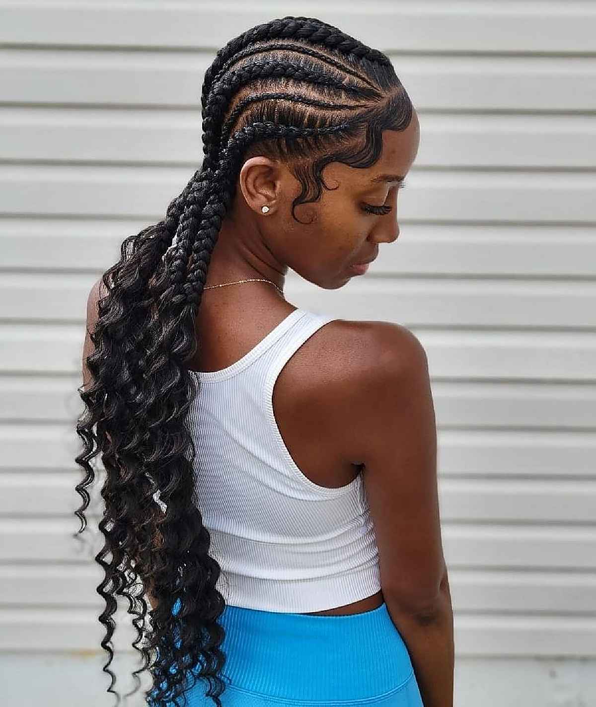 You can always opt for stylish goddess braids if you need more time to get traditional small Fulani braids. Because the feed-in braids are huge, the ends are made wavy differently. Ask your braider to give you wavy ends by curling the braids themselves.