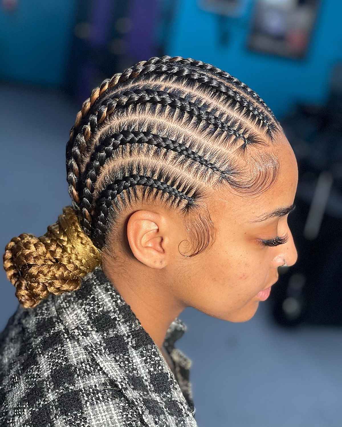 Brighten your beautiful face by embracing a goddess braid top knot and letting a few locks cascade down for you to accessorize! This look features an array of elements – beads, strings, exquisite cornrows, and that delightful blend of brown and blonde. It’s amazing how they harmonize flawlessly! Goddess feed-in braids updo styles are stylish for any casual or formal occasion.