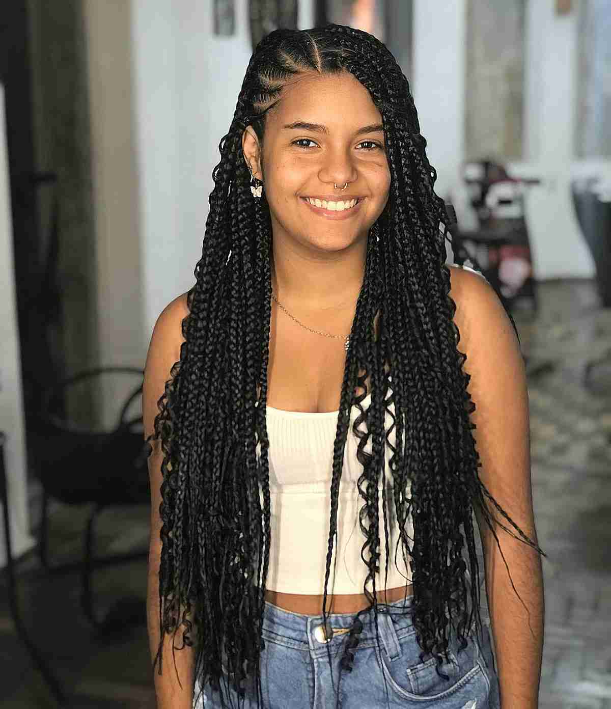 A soft twist on large knotless braids features stunning gypsy braids that come in super long lengths. Ask your braider to incorporate your favorite curl design (human hair is always best) with your braids for an elegant look. A playful variation is to style them into a messy high bun, letting the curls cascade naturally.
