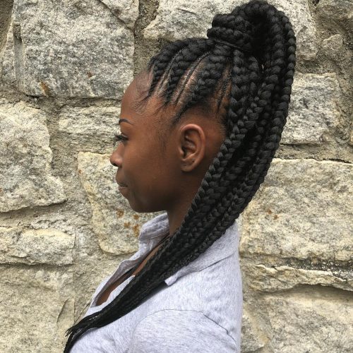 These bold goddess braids styled in a ponytail are polished and sleek, allowing the back of your neck to feel free! Achieve it by tossing those braids and securing them high and snug. Incorporate some fine cornrows in between those large goddess braids for added distinction.