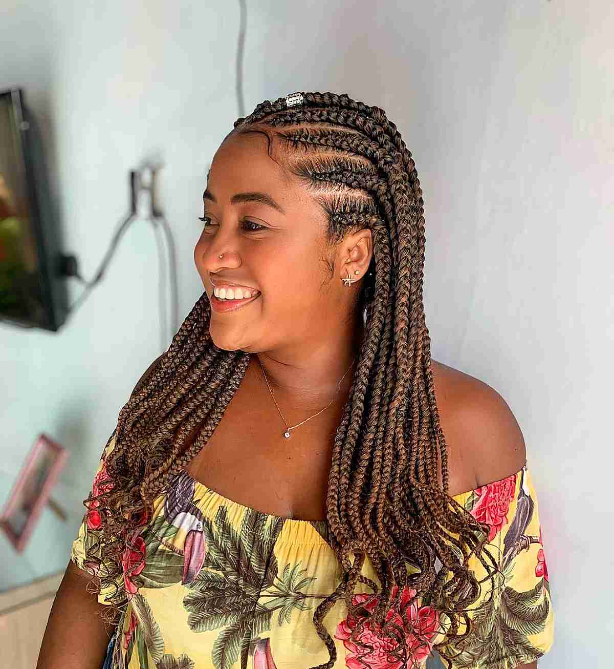 Here’s a Ghana braids style that exemplifies how to incorporate a side part into your goddess braids’ hairstyles. Focus on those larger sections by coloring them with various shades of brown in an ombre effect and positioning most of them on one side of your face.