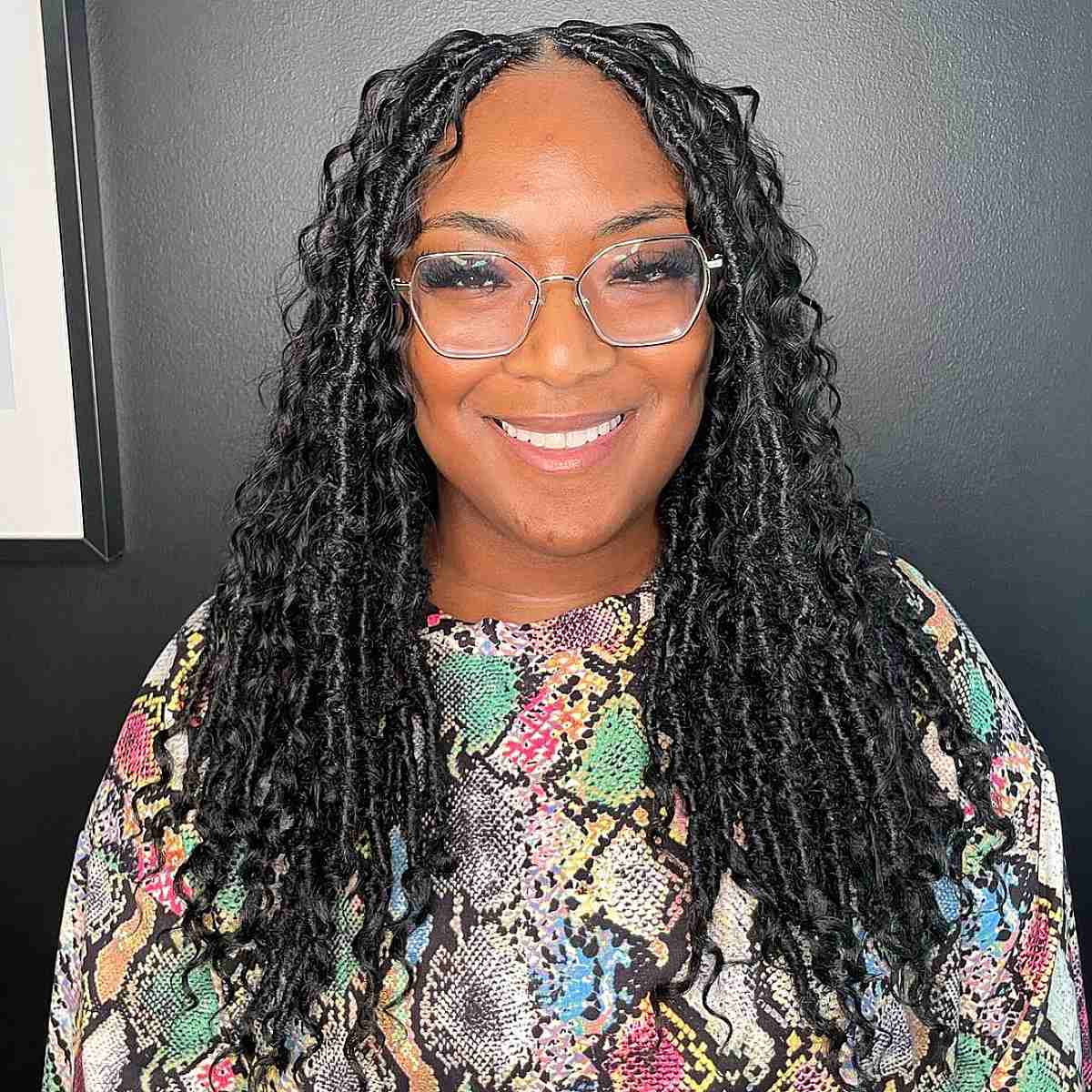 Experiment with elegant loose curls combined with medium goddess braids to enhance your laid-back style. The looser the curls, the more length you’ll retain in your look. The beauty of goddess braids lies in their diverse curl patterns, sizes, and lengths.