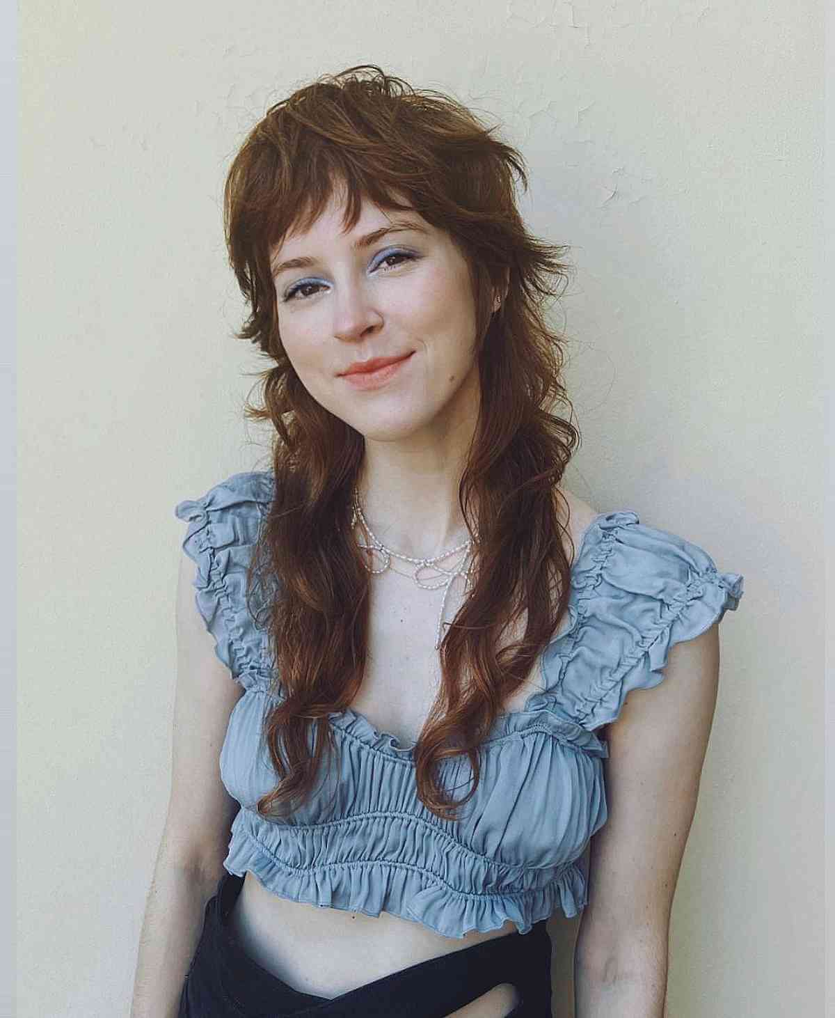 Consider a textured shaggy mullet with bangs. This ideal hairstyle blends the boldness of a shag and a mullet. Crown layers and face-framing enhance the shag effect, while the long flowing hair at the nape adds a touch of mullet flair. If possible, adapt your face shape with those tousled facial layers. Allow the hair to flow in the back with layers for a lighter appearance or fewer layers for a more distinct style.