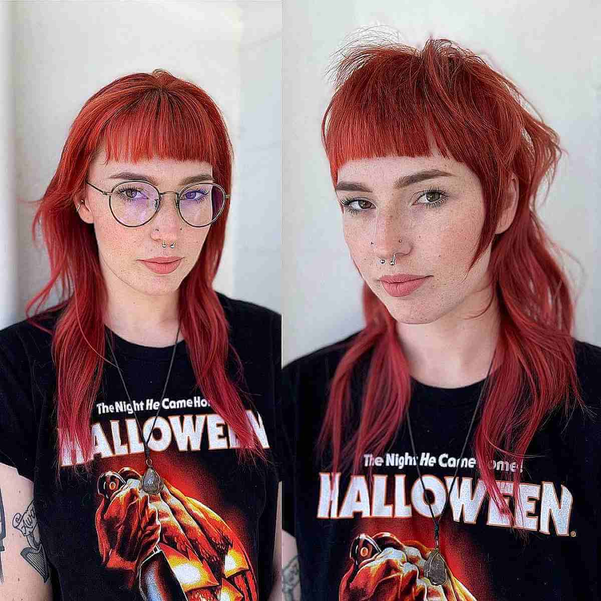 Here’s an edgy copper mullet with fringe. If you’re in search of the ideal shullet, your quest ends here. You can achieve intriguing shapes with a disconnected cut. You can soften the face and cut around the ears while allowing for playful textured movement throughout the back. Avoid straight lines with this cut so it doesn’t resemble a bowl. To preserve a soft look, request your stylist for plenty of texture.