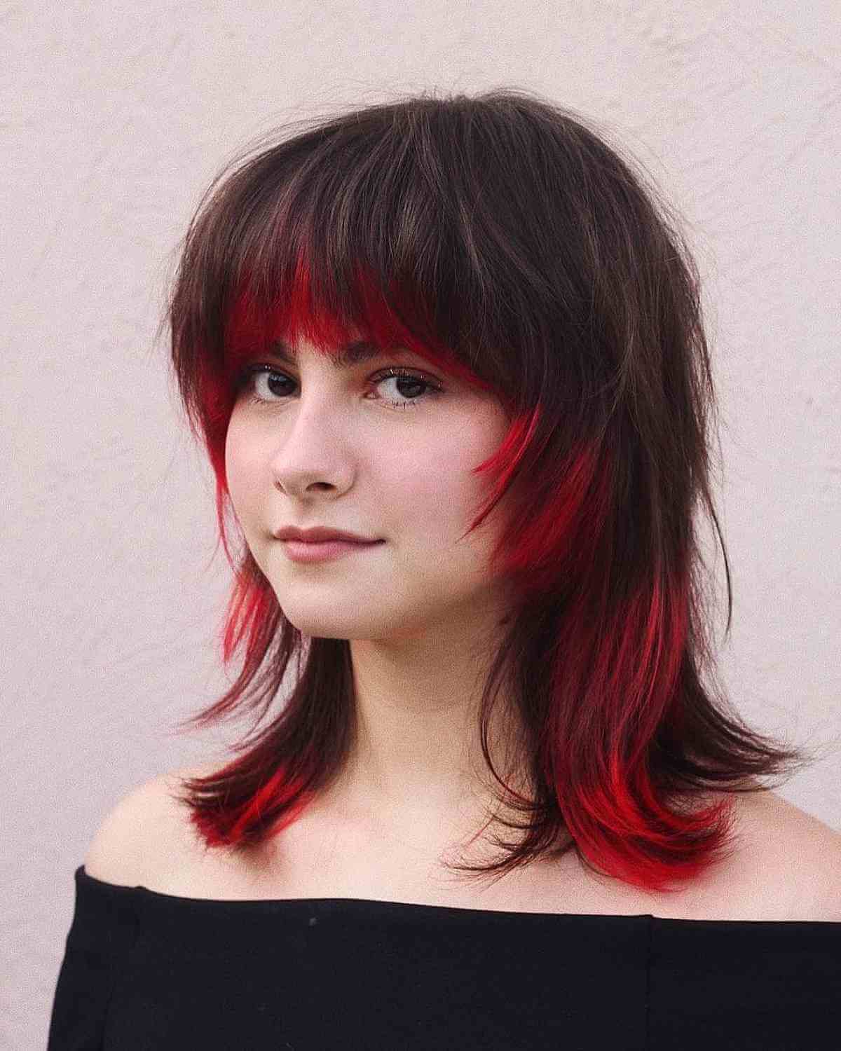 If you’re looking to infuse some vibrancy into your brunette hair, try adding layers and bangs with red accents. Layers of red and deep chocolatey brown draw attention to your eyes. Peek-a-boo color blocking is a fun way for brunettes out there to add a little bit of enchantment to their style without all the maintenance of a traditional highlight. Because the red is peeking out from the brown, you won’t even notice when your new growth starts to grow in.
