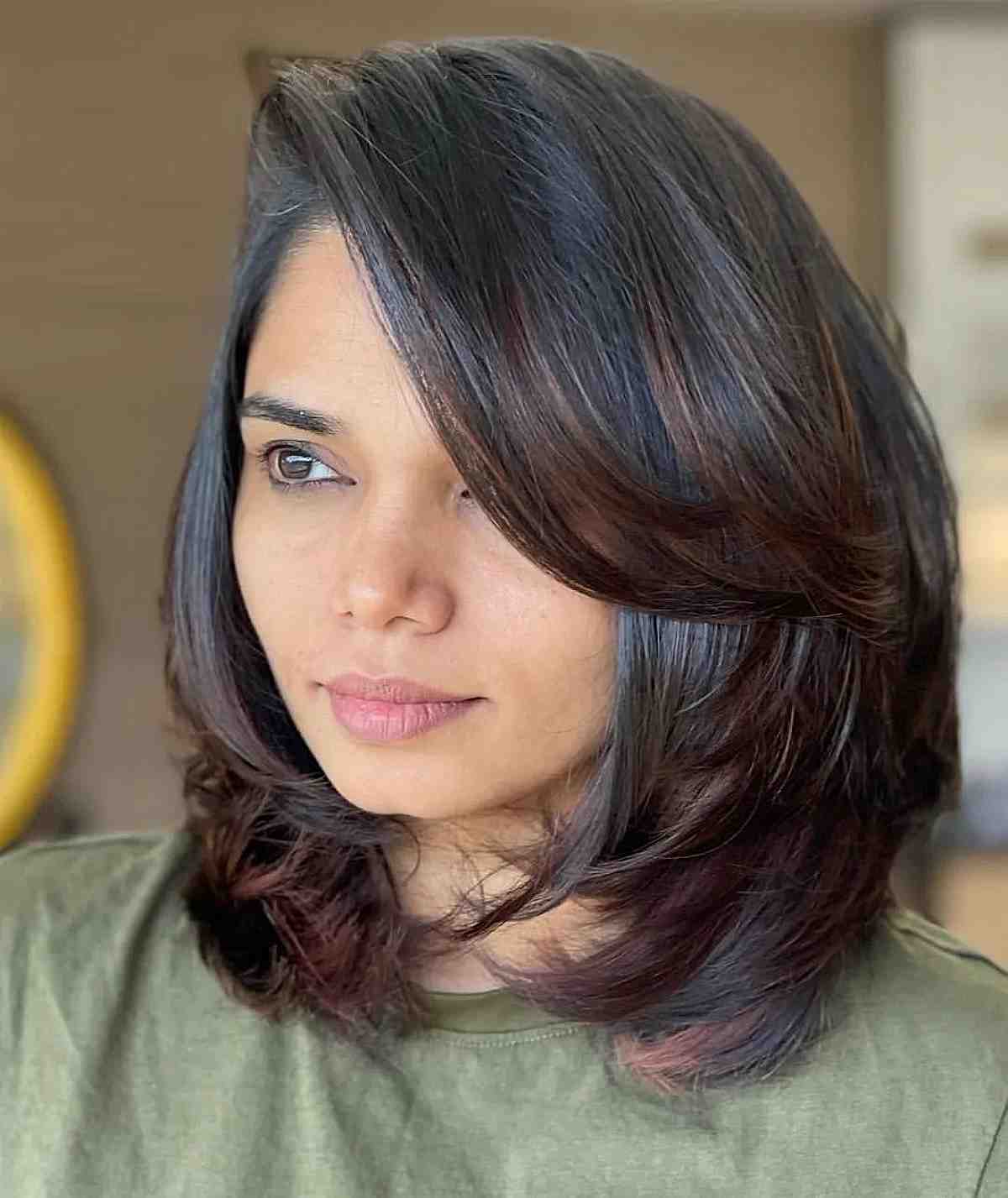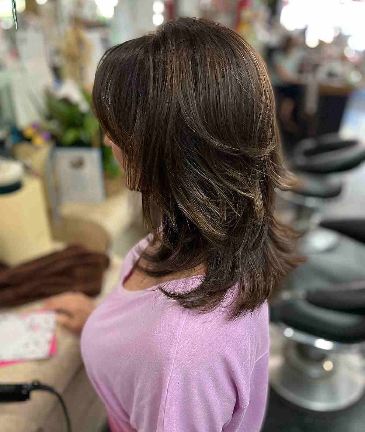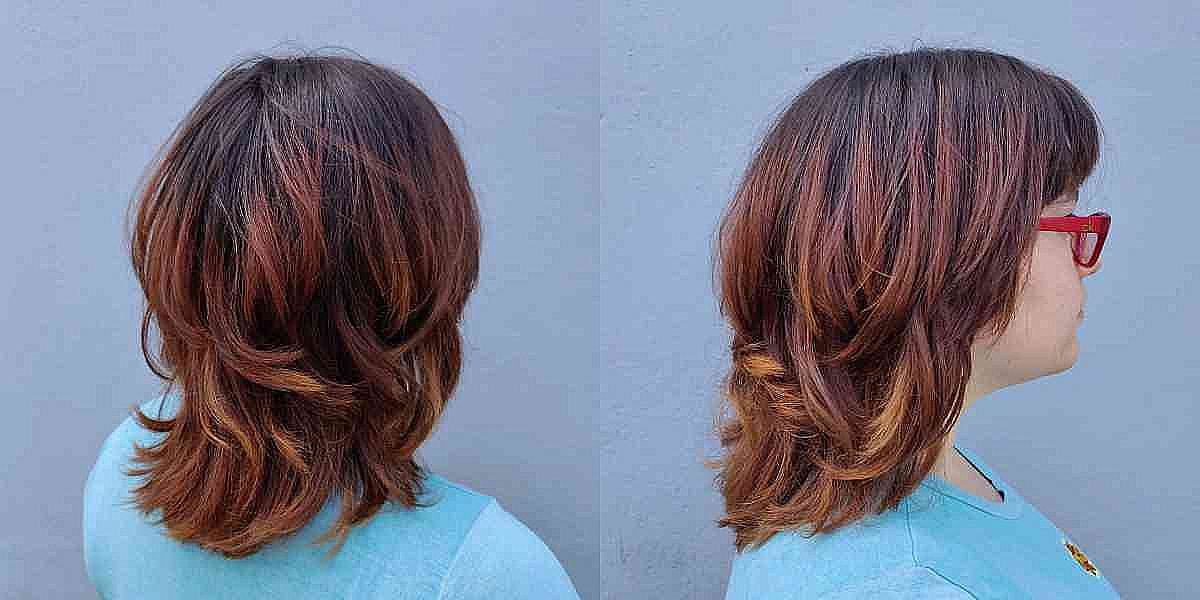The fusion of short and medium layers brings immediate body, volume, and definition. This haircut is ideal for women with medium to thick hair. To achieve a swoopy appearance, ask your stylist to guide you on using a round brush to highlight the layers.