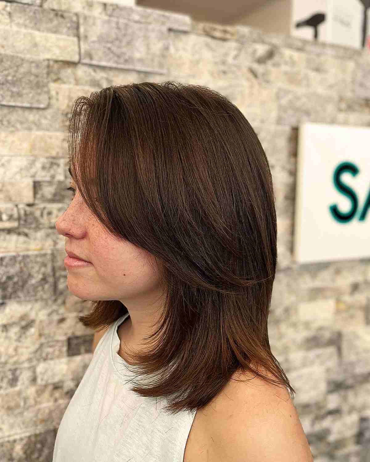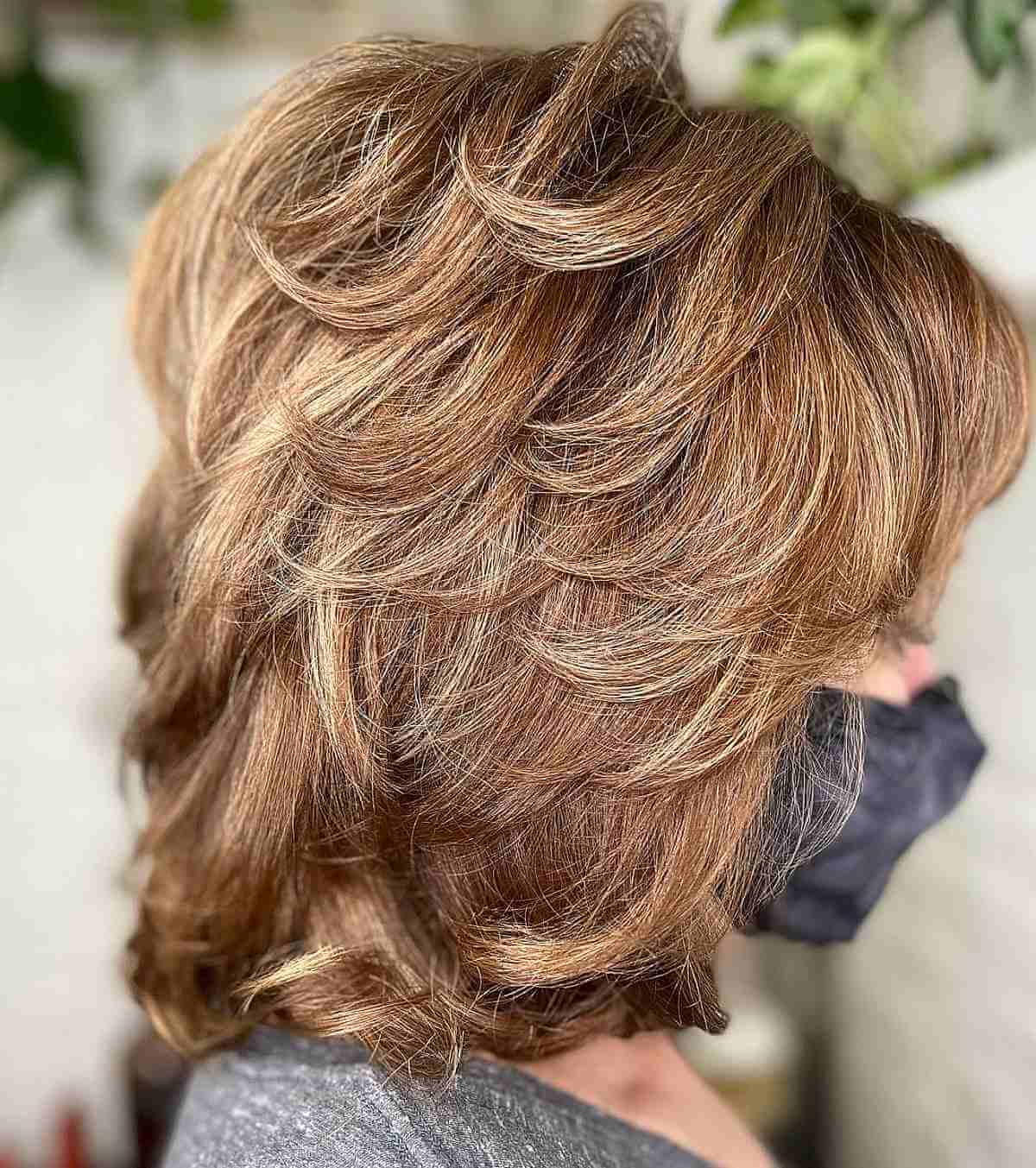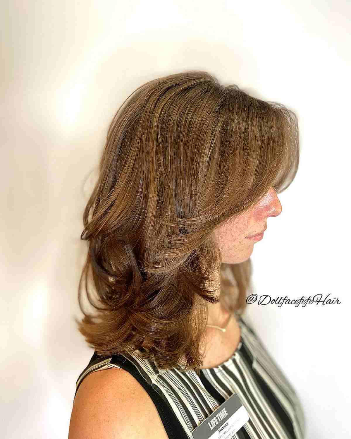 The fusion of short and medium layers brings immediate body, volume, and definition. This haircut is ideal for women with medium to thick hair. To achieve a swoopy appearance, ask your stylist to guide you on using a round brush to highlight the layers.