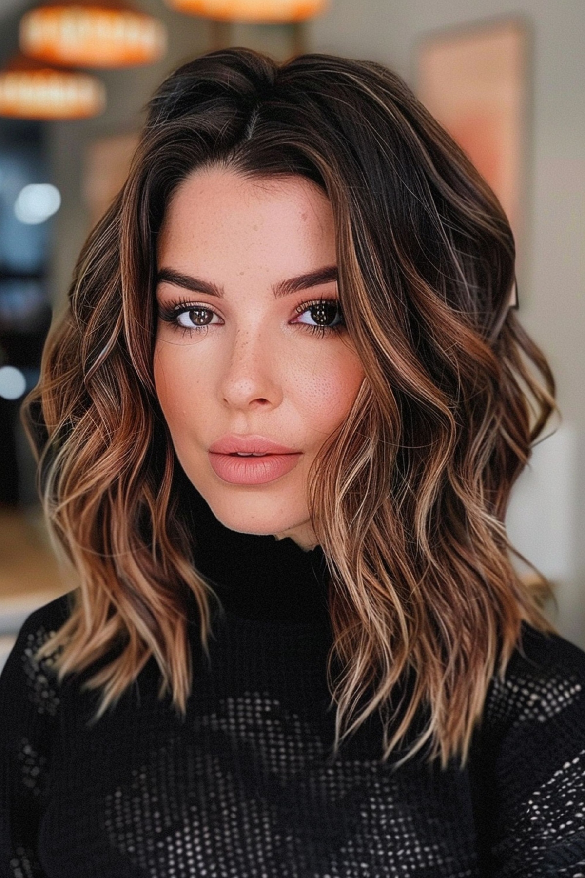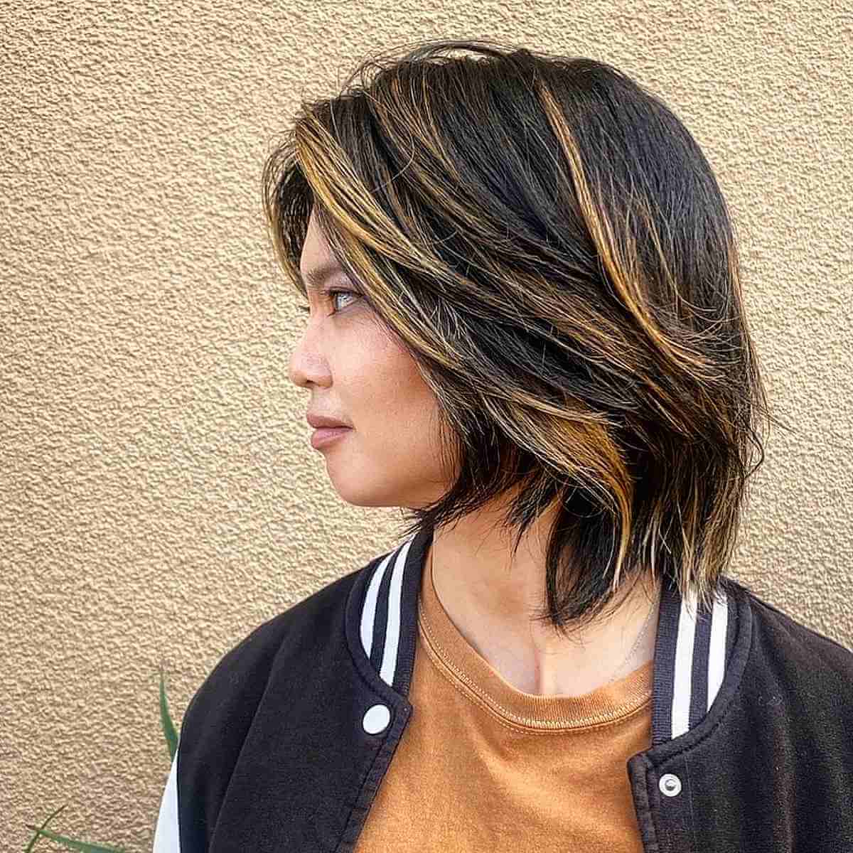 You’ll adore a chic short layered bob with golden highlights. A shaggy bob is incredibly stylish and straightforward to manage. I recommend a tousled finish, which can be achieved by blow drying with your hands or a medium round brush, moving away from your face. Complete your look with caramel-toned highlights, which enhance brunettes beautifully.