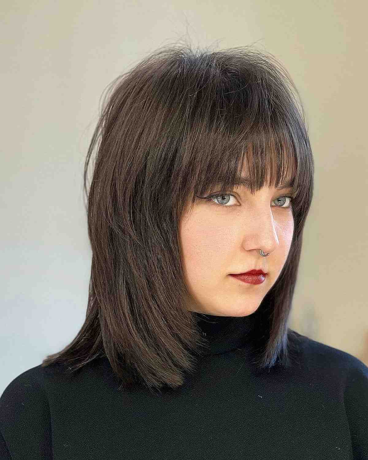 A contemporary shaggy lob with bangs is a haircut with lots of choppy layers. To keep this style full of volume, your stylist may use a technique called slide cutting. This will incorporate shorter pieces into your hair which will add texture and give you tons of volume. Slide-cutting the bangs will give you defined pieces over your forehead that complement the rest of your haircut.