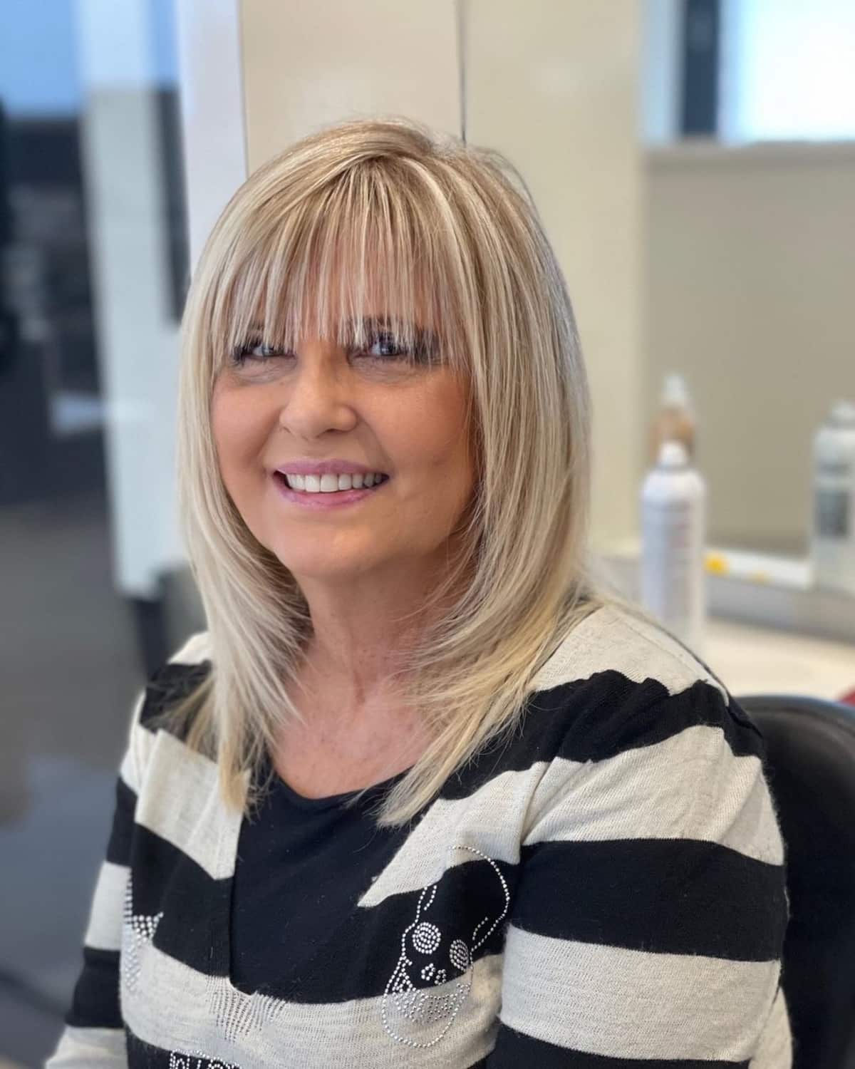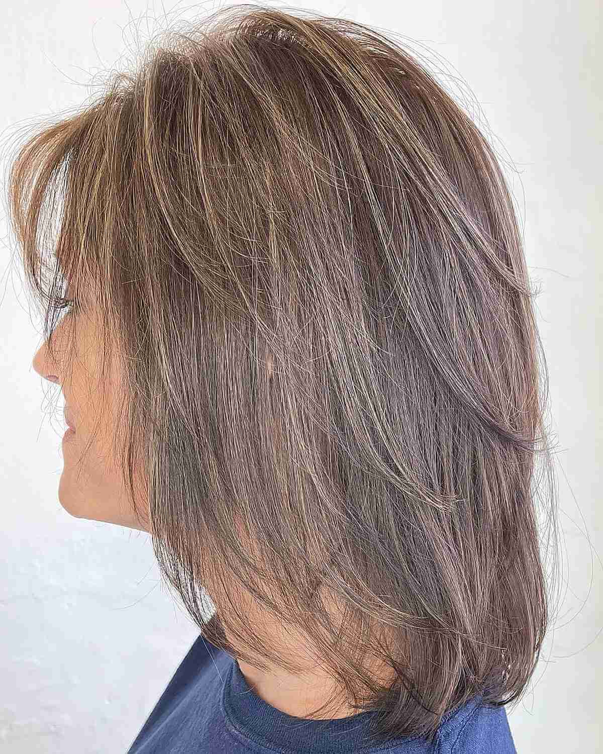 A textured mid-length shag cut with bangs for women over 50 has shorter strands in the front and longer layers in the middle and back. Opt for haircuts like this if you want to enhance texture, volume, and bounce.