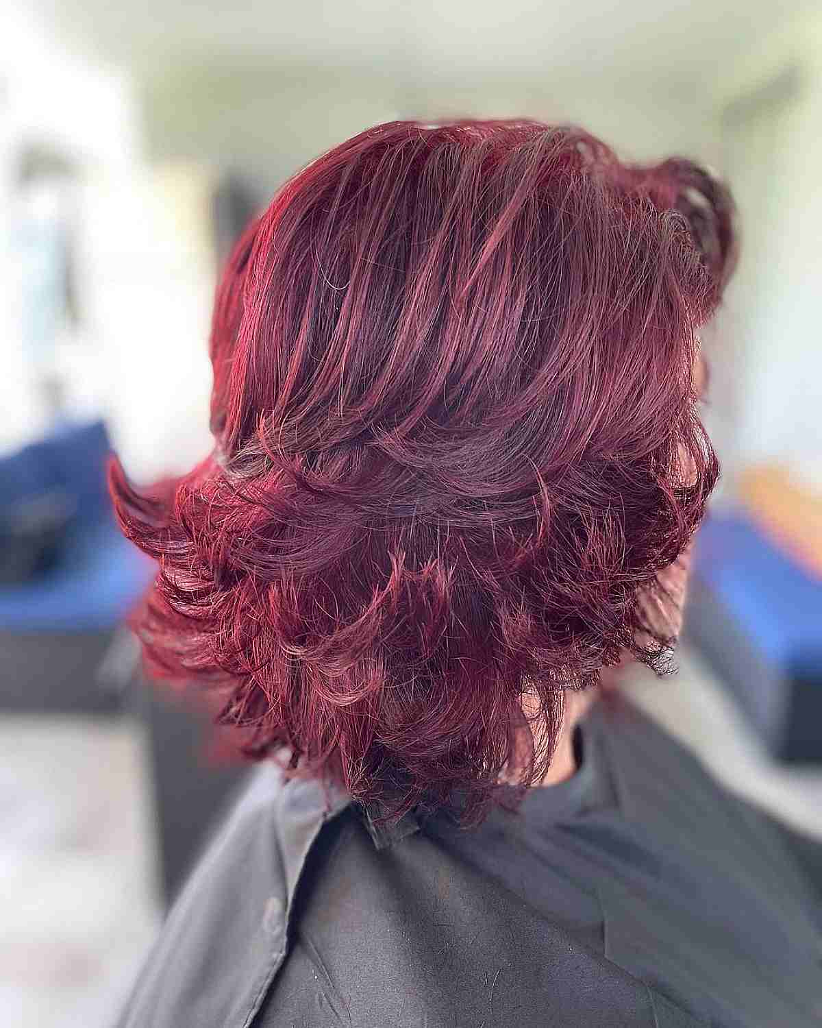 Hair with feathered tips offers a full, textured haircut that is perfect for women of all ages. The wispy ends enhance style and shape to your shoulder-length look, so consider a vibrant red hue to truly elevate your appearance.